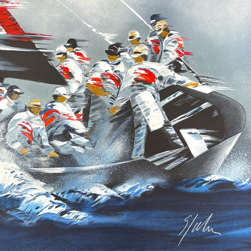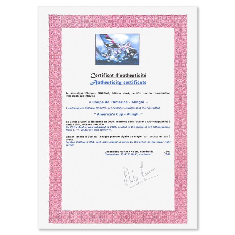 "America's Cup - Alinghi" is a limited edition lithograph on paper by Victor Spahn. Printed at Art-Lithographies workshop in Paris, the piece is hand signed by the artist and comes with a certificate of authenticity. This piece is custom framed. Measures approximately 25" x 31.5" (frame), 17" x 23.5" (image).