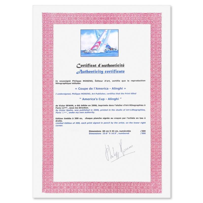 "America's Cup - Alinghi" is a limited edition lithograph on paper by Victor Spahn. Printed at Art-Lithographies workshop in Paris, the piece is hand signed by the artist and comes with a certificate of authenticity. Measures approximately 17" x 23.5" (image).