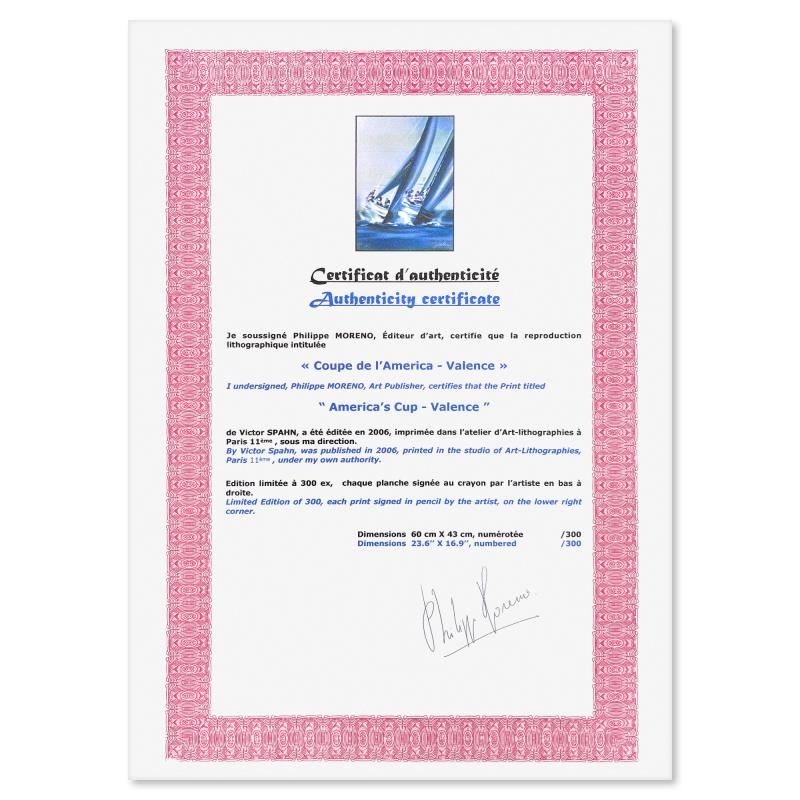 "America's Cup - Valence" is a limited edition lithograph on paper by Victor Spahn. Printed at Art-Lithographies workshop in Paris, the piece is hand signed by the artist and comes with a certificate of authenticity. This piece is custom framed. Measures approximately 31.5" x 25" (frame), 23.5" x 17" (image).