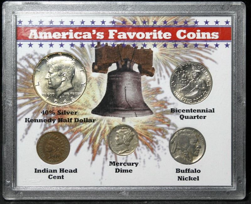 America's Favourite Coins - 5 Coin Set - 40% 1968 Silver 50-Cent, Bicentennial Quarter, Indian Head Cent, Mercury Dime & Buffalo Nickel