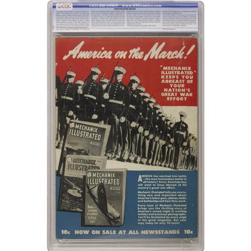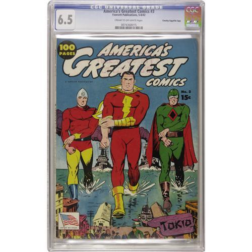 <B>America's Greatest Comics #3 Crowley Copy/File Copy (Fawcett, 1942) CGC FN+ 6.5 Cream to off-white pages.</B></I> Captain Marvel, Bulletman, and the Spy Smasher prepare to go Godzilla on the city of Tokyo on the stirring wartime cover of this 100-page giant. Fawcett giants are hard to come by in high grades, and only one other issue is graded higher than this one in the current CGC census. The colors and gloss on the cover of this copy are exquisite, and only some light spine wear and corner creases keep it from grading higher. It also bears a "checking copy" stamp on the front cover. Overstreet 2006 FN 6.0 value = $321; VF 8.0 value = $669. CGC census 10/06: 1 in 6.5, 1 higher.<BR><BR><b>Shipping:</b> Slabbed Comic (<a target="_blank" href="http://www.heritageauctions.com/common/shipping.php">view shipping information</a>)