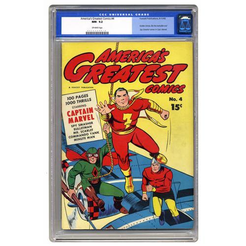 <B>America's Greatest Comics #4 (Fawcett, 1942) CGC NM- 9.2 Off-white pages.</B></I> This massive 100-pager has everyone who was anyone at Fawcett, with Captain Marvel, Bulletman and Bulletgirl, Spy Smasher, Minute Man, Mr. Scarlet and Pinky, and Commando Yank all starring in their own features. Spy Smasher also cameos in Captain Marvel's story, which is a real <B>Whiz Comics</B></I> reunion with Ibis and Golden Arrow popping in as well. Oddly, whoever bought this copy off the newsstand seems to have resisted the temptation to give it a read -- it's nearly perfect, which is saying a lot for a square bound comic from the Golden Age. Overstreet 2006 NM- 9.2 value = $1,050. CGC census 3/06: 1 in 9.2, none higher.