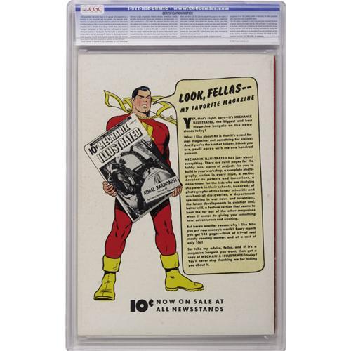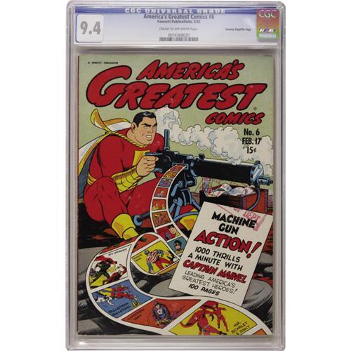 <B>America's Greatest Comics #6 Crowley Copy/File Copy (Fawcett, 1943) CGC NM 9.4 Cream to off-white pages.</B></I> Captain Marvel is really going to town with his water-cooled, .30 caliber, belt-fed machine gun on this World War II classic. Instead of shell casings, this gun is running a strip previewing all the contents that appear on this issue's 100-pages. Everyone knows these squarebounds are impossible to find in high grade due to the delicate nature of the soft cardboard cover, and yet here's a stunning 9.4! The cover bears a "checking copy" stamp. Overstreet 2006 NM- 9.2 value = $960. CGC census 10/06: 1 in 9.4, none higher.<BR><BR><b>Shipping:</b> Slabbed Comic (<a target="_blank" href="http://www.heritageauctions.com/common/shipping.php">view shipping information</a>)