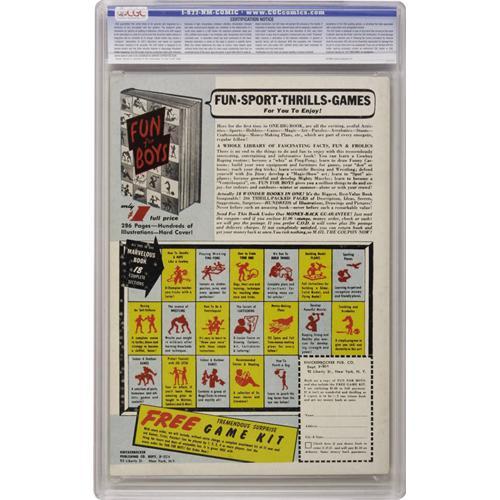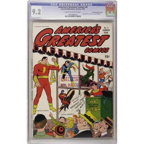<B>America's Greatest Comics #8 Crowley Copy/File Copy (Fawcett, 1943) CGC NM- 9.2 Cream to off-white pages.</B></I> Go under the big top with Billy Batson and the greatest comics heroes in the world! The cover of this book is really powerful, the heroes seem to come right out at you. Unlike most of these cardboard bound Fawcetts, this one has aged very well. The front cover bears a "checking copy" stamp. Overstreet 2006 NM- 9.2 value = $960. CGC census 10/06: 1 in 9.2, 1 higher.<BR><BR><b>Shipping:</b> Slabbed Comic (<a target="_blank" href="http://www.heritageauctions.com/common/shipping.php">view shipping information</a>)