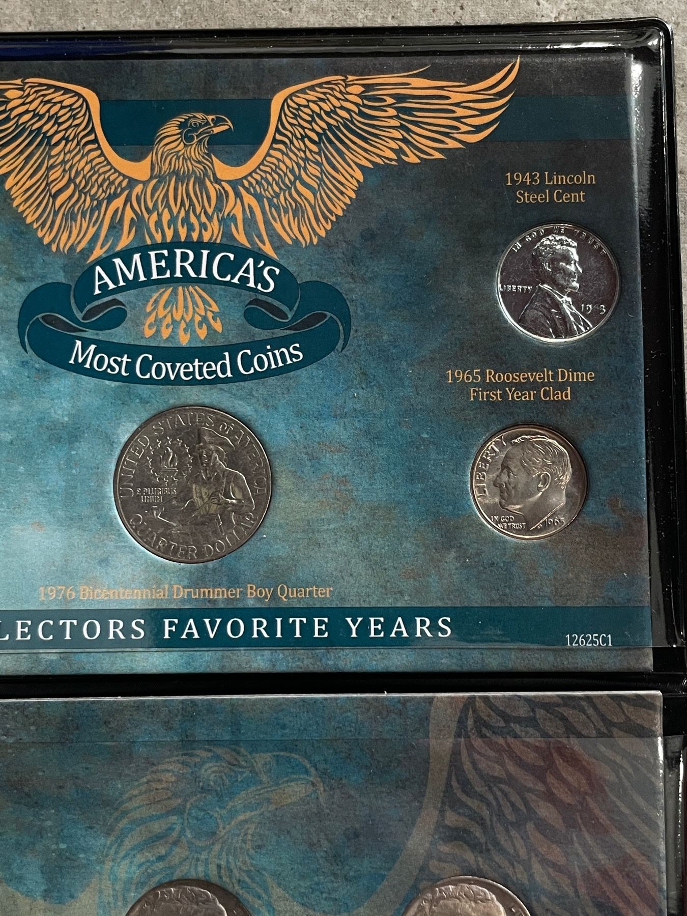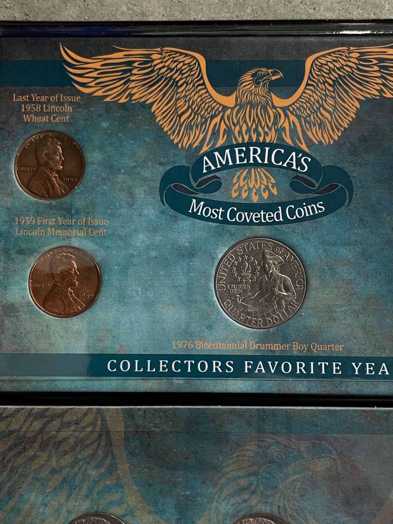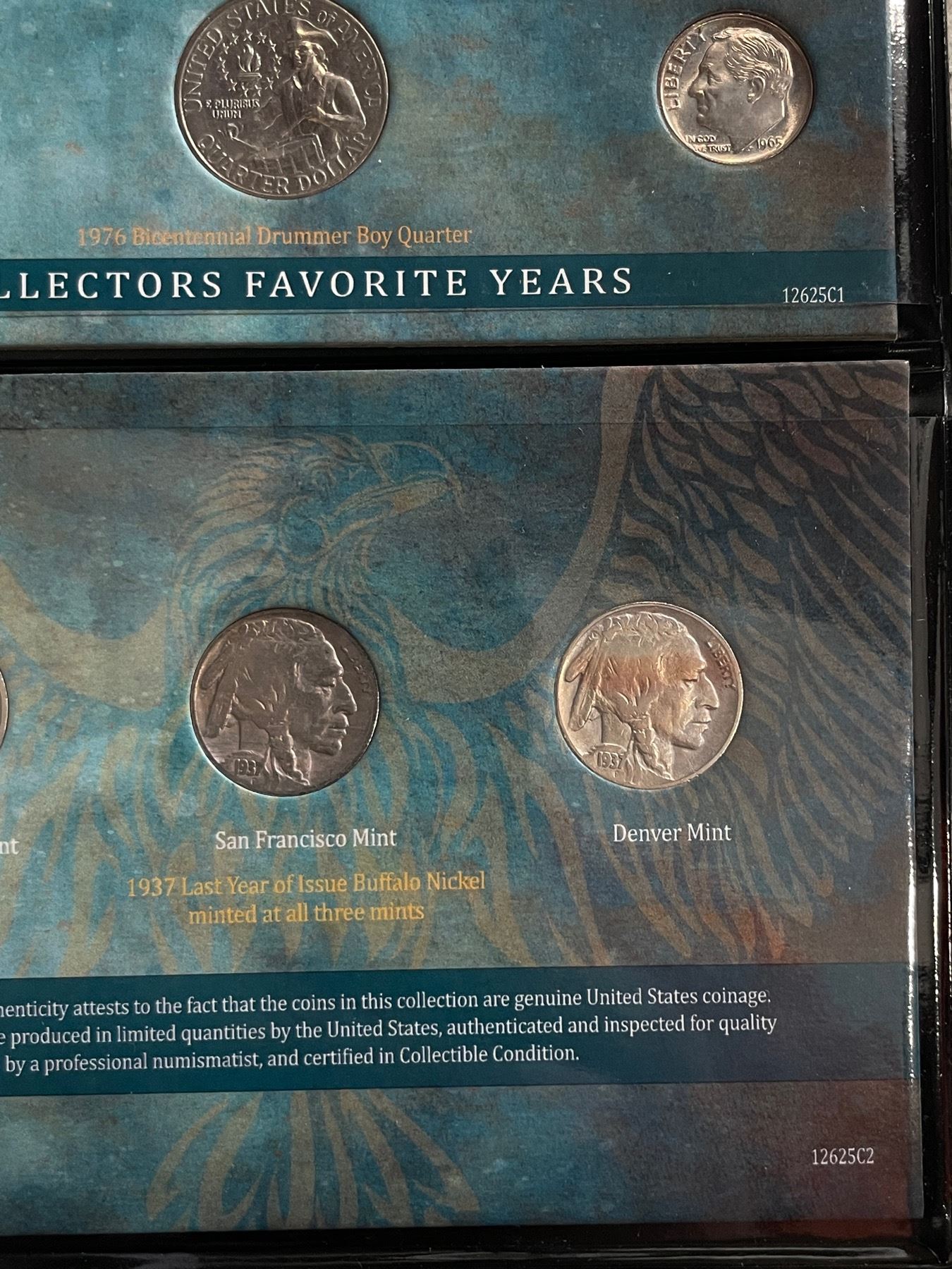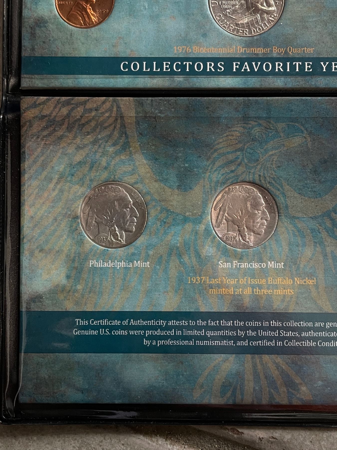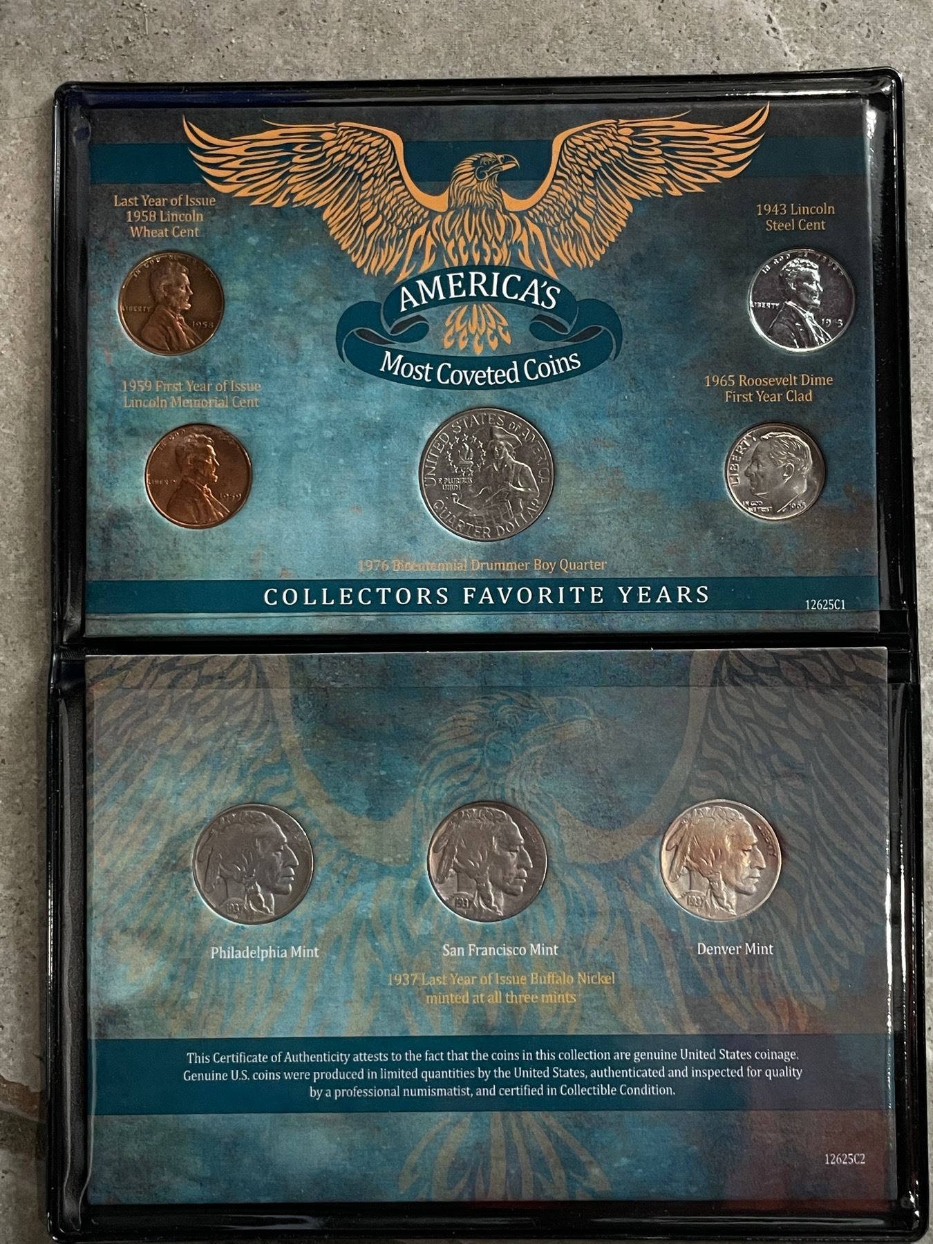 Includes three different mint buffalo nickels, steel penny, wheat cent, and other coins in case.