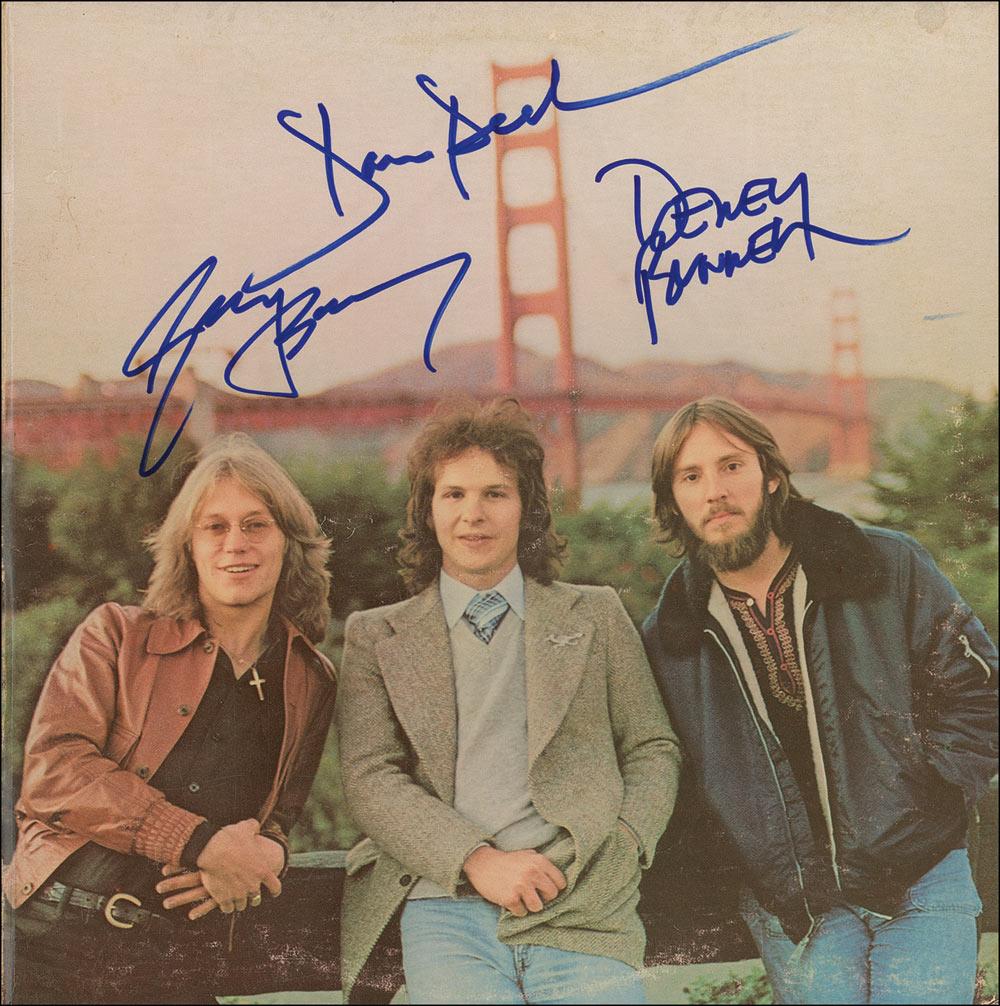 Hearts album signed on the front cover in blue felt tip by Dan Peek, Dewey Bunnell, and Gerry Beckley. In fine condition, with bend along the left edge, spots of soiling, and a bit of scattered wear. The record is not included.