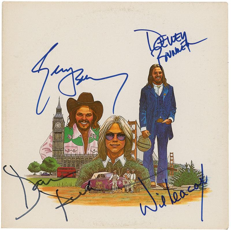 Greatest Hits album signed on the front in blue felt tip by Gerry Beckley, Dewey Bunnell, Dan Peek, and Willy Leacox. Scattered surface rubbing, mild wear to the corners and edges, and a light ‘ring of wear’ on the front, otherwise fine condition. The record is not included.