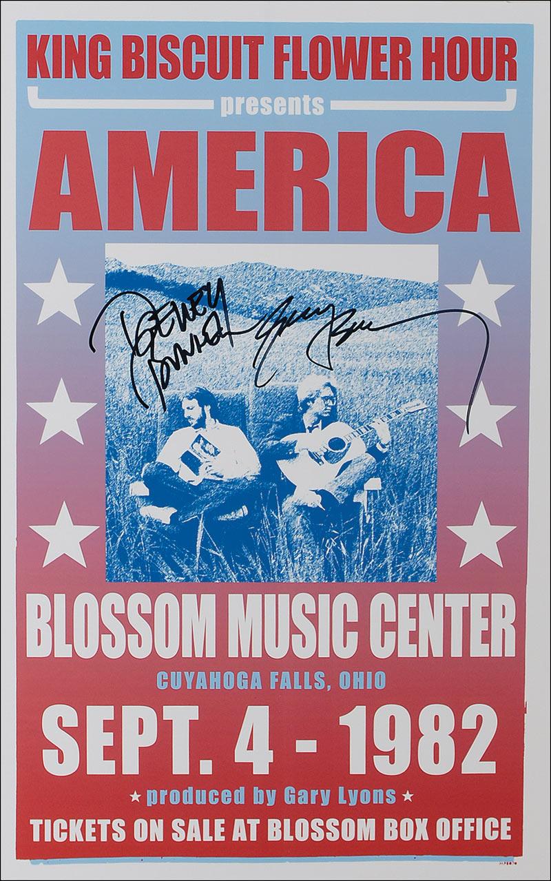 Color 12 x 18 photo of a poster for a 1982 America concert in Cuyahoga Falls, Ohio, signed in black felt tip by Gerry Beckley and Dewey Bunnell. In very fine condition.