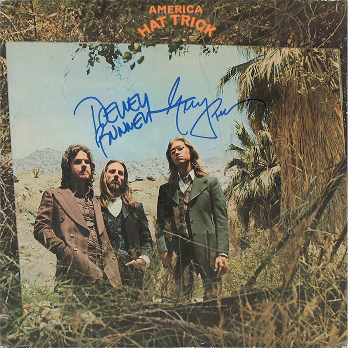 Hat Trick album signed on the front in blue felt tip by Dewey Bunnell and Gerry Beckley. Scattered light creasing and mild corner wear, a discount cut to the left edge, and light ‘rings of wear’ to the front and back, otherwise fine condition. The record is included.
