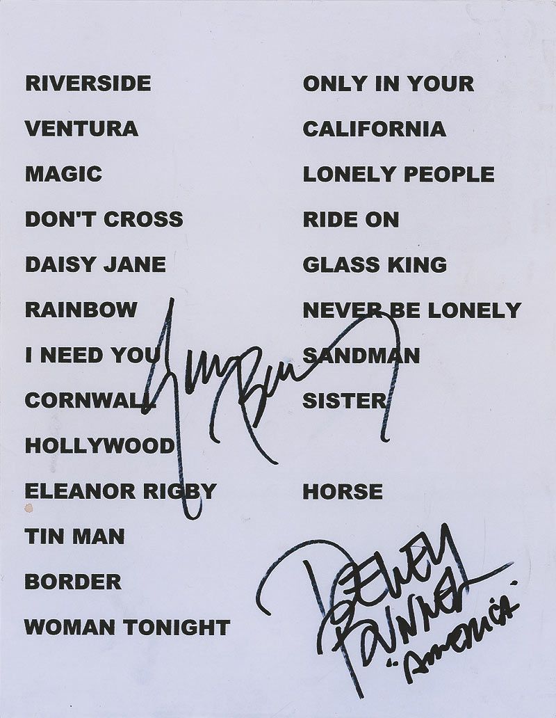 Printed set list from a March 14, 2008, concert on an off-white 8.5 x 11 sheet. List consists of 22 songs including many of their classics, and is signed in black felt tip by Dewey Bunnell and Gerry Beckley. In fine condition, with a few light bends and creases. Accompanied by a computer printed orchestra pit ticket from the show. Consignor notes that this set list was taped to the stage floor and later pulled up after the show to be signed.