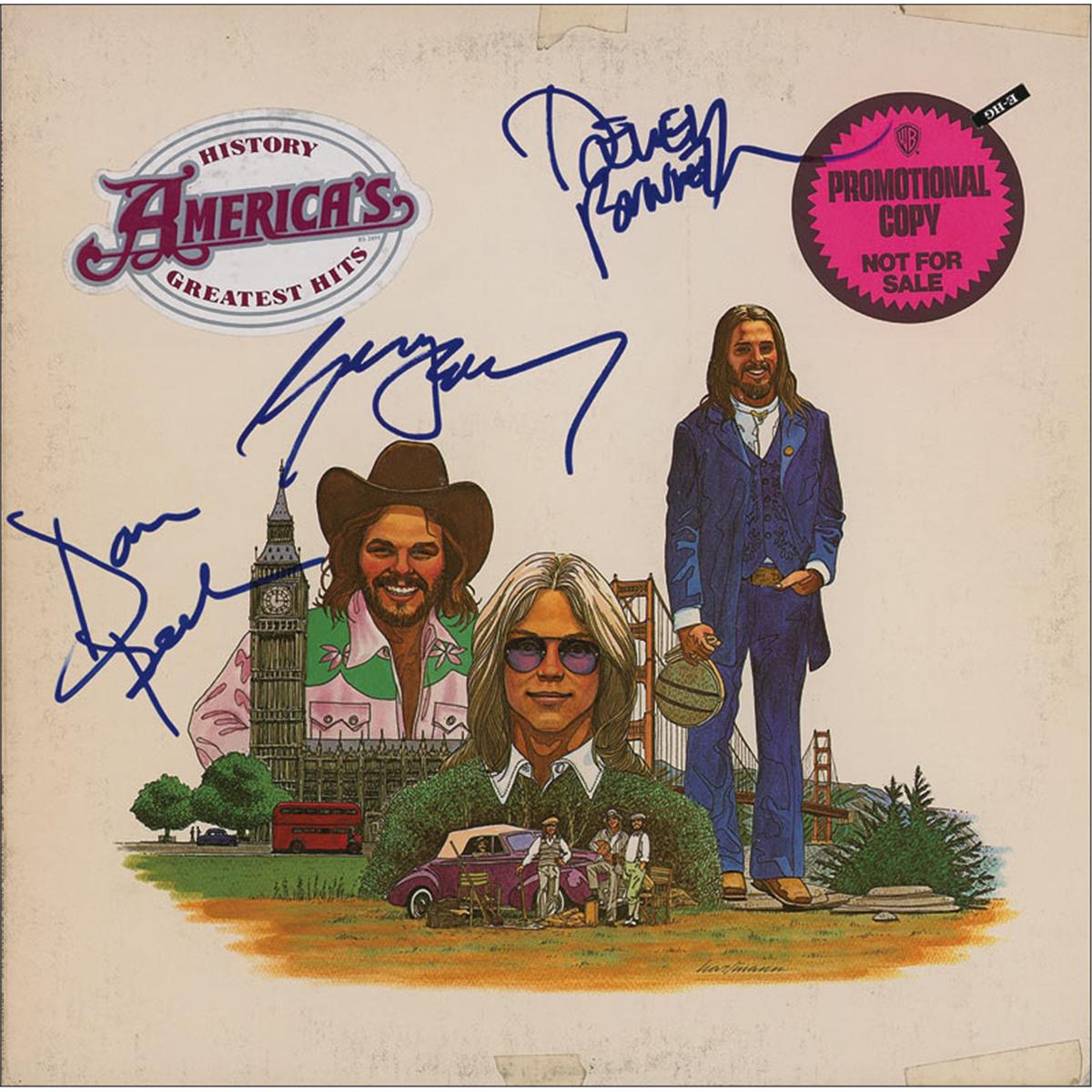 Promotional copy of History: America’s Greatest Hits album signed on the front cover in blue felt tip by Dan Peek, Dewey Bunnell, and Gerry Beckley. In very good condition, with promotional label affixed to front cover, partial separation along bottom edge, and several pieces of tape to horizontal edges. The record is not included.