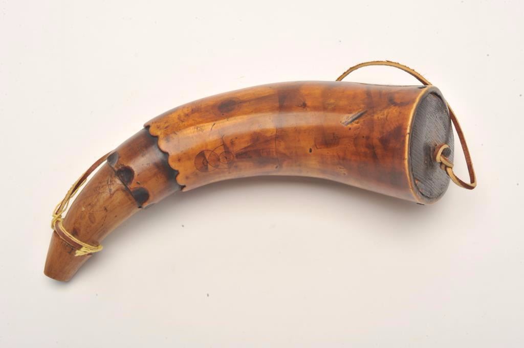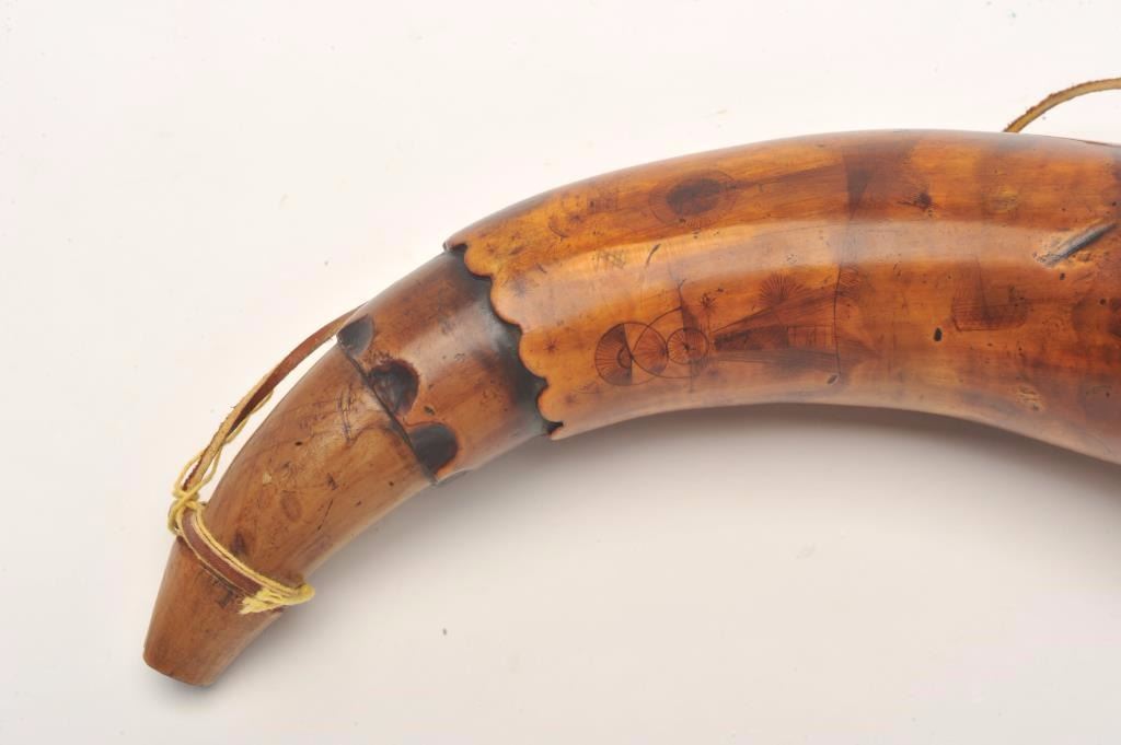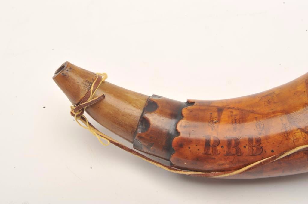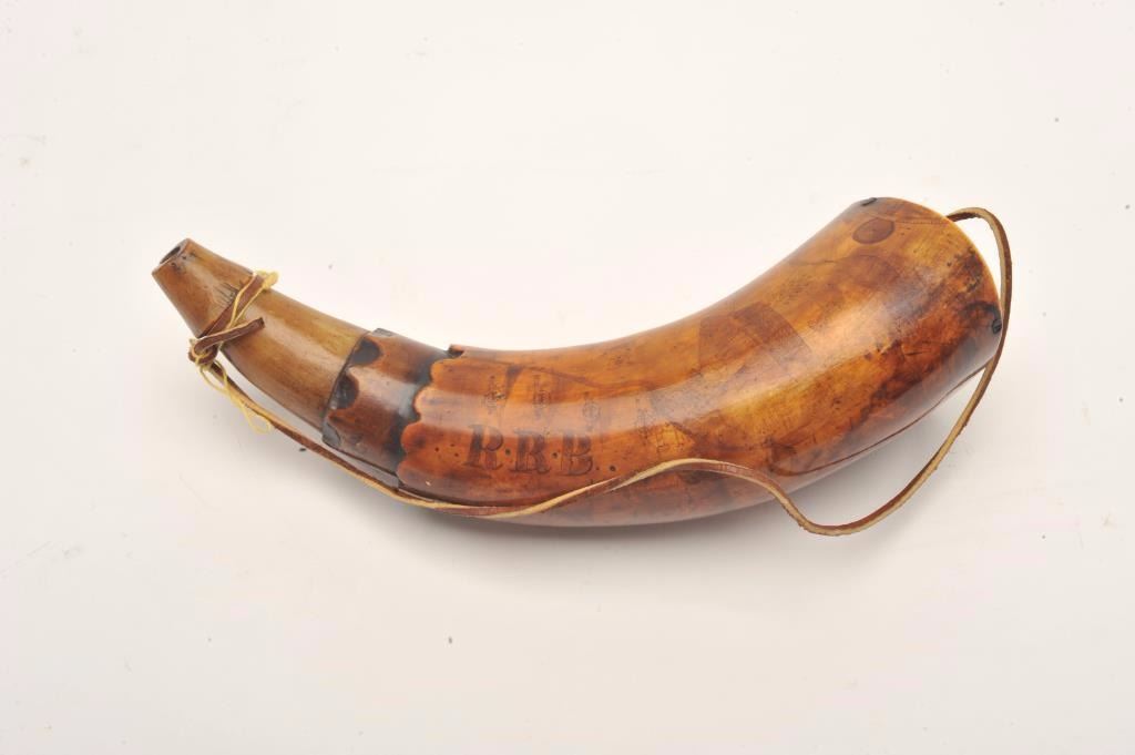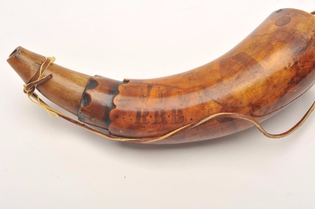 American 18th Century carved powder horn, approximately 10” overall with wood base plug showing a ship, a man, geometric design work and the initials “RRB”; nicely accomplished. Est.: $900-$1,800.