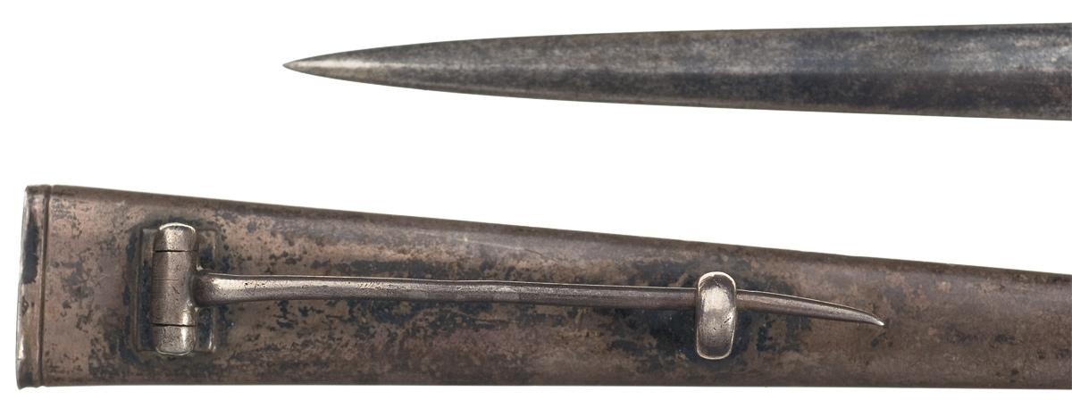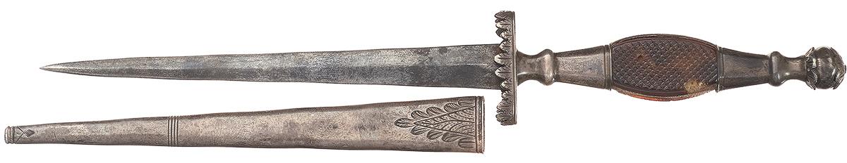 This American dirk has a 4 1/2" blade with artfully shaped guard. The silver handle has a round pommel with a floral blossom inserted on the top. The handle also has checkered tortoise shell grip panels (note that each panel has different sized checkering). OAL: 7 3/4". Complete with a unique silver scabbard which has a pin on the back for attaching to a coat lapel for concealment. Consignor notes states that the holdout pin concept is the product of revered American edged weapon maker Samuel Bell, possibly making this part of his extremely scarce body of work