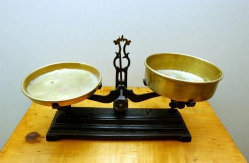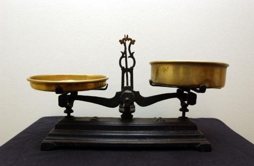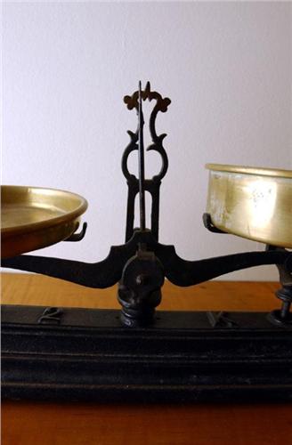 Antique brass balance scale with cast-iron base, slight rust on cast-iron. 9 1/4" 13 1/2" by 6"