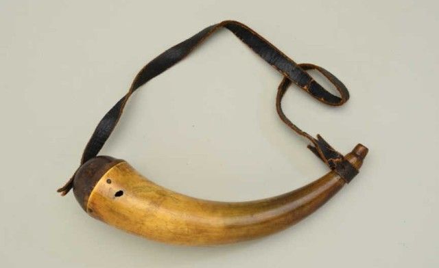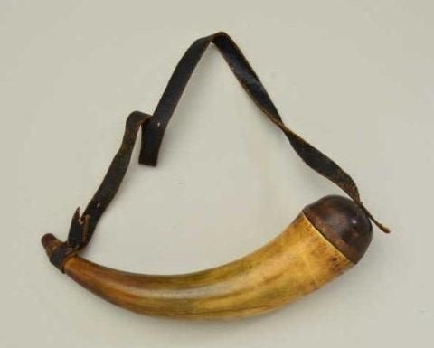 American 19th century powder horn with carved initials “MB” in script with leather strap, plug and in very good condition for its age which we would date at 1800-1840’s by style. From a northwest collection. Est.;$250-$500.