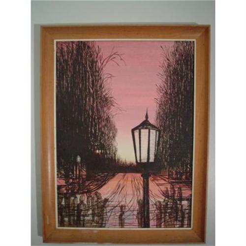 Robert Shannon (American) Mid 20th.c Street scene in the style of Bernard Buffet. Excellent condition & measures 30"x21.5". Excellent decorating painting of a street scene at sunset. Framed. Signed lower left.