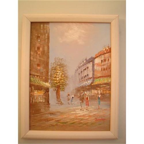 Burnett (American 20th.c)Oil on canvas. Paris street scene in the manner of Cortes & Blanchard.Fine painting by an up & coming Florida artist.Framed & in very good condition. Measures 16"x12".