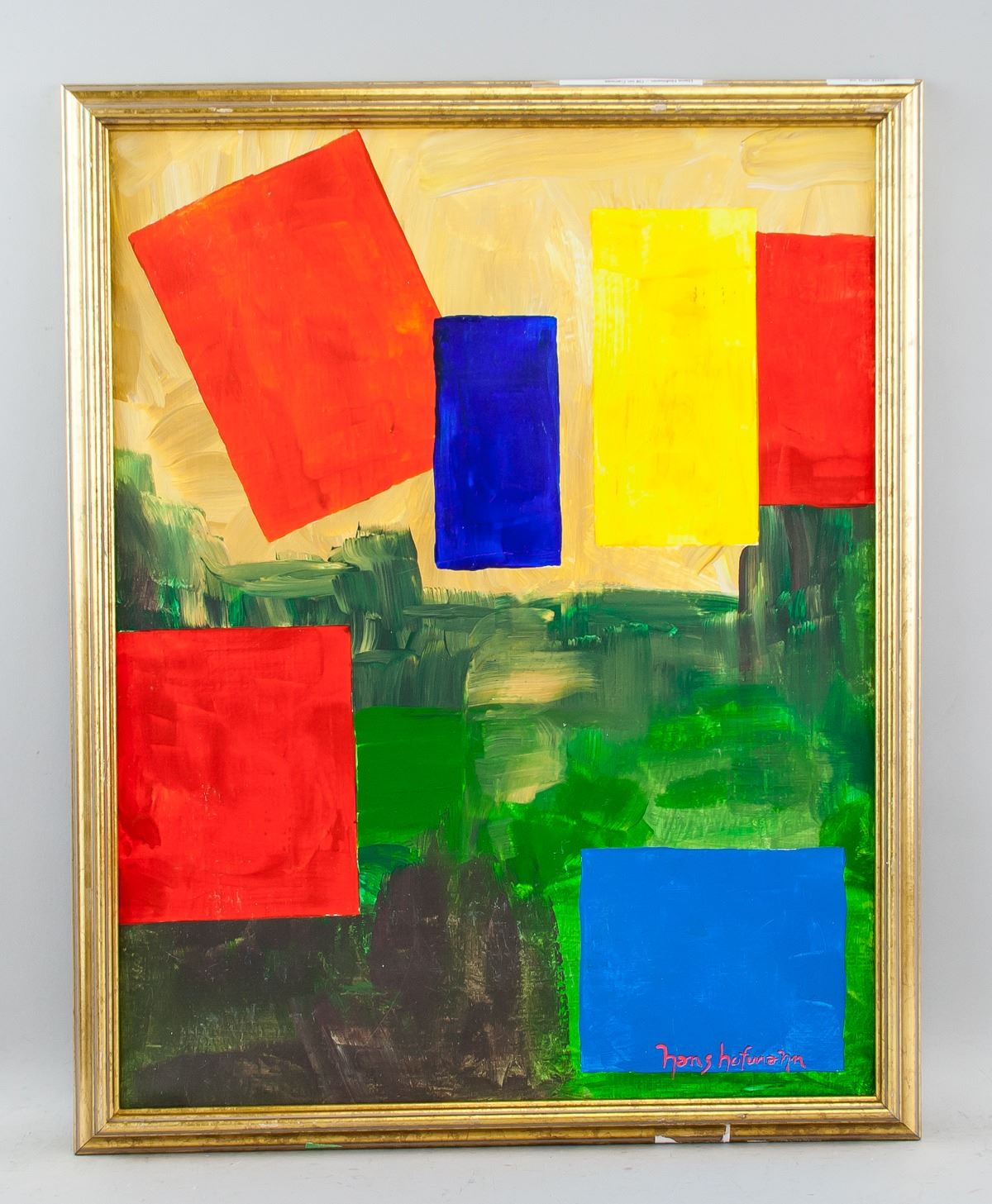 Oil on stretched canvas, featuring abstract expressionist composition. American Abstract School, signed Hans Hoffman on the lower right corner. 50 x 39.5 cm (19.7 x 15.6 inches). PROVENANCE: Southern Ontario estate.