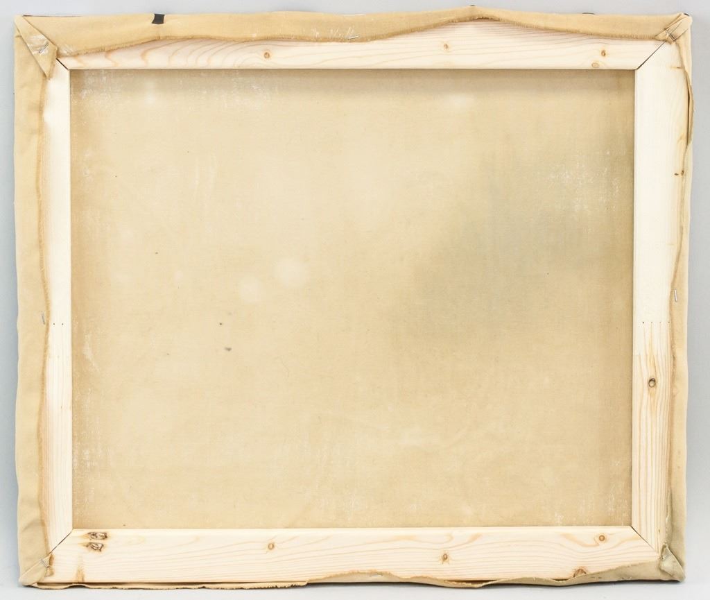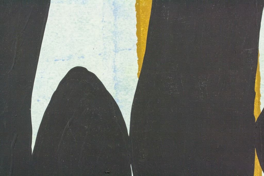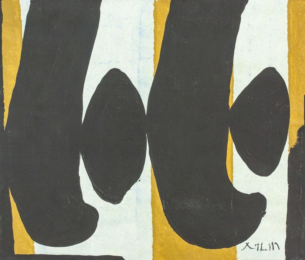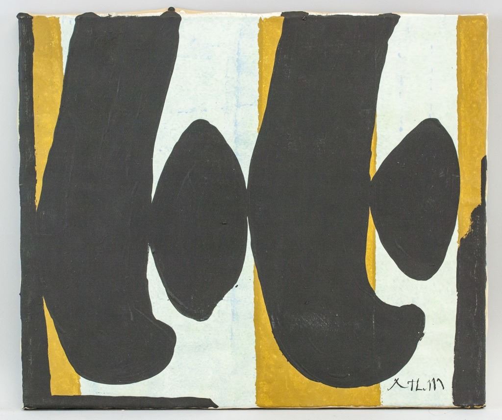 Oil on canvas. Featuring abstract composition of broad black shapes against a yellow and white background. Signed in the bottom right corner. After Robert Motherwell. 40 x 47 cm (15.75 x 18.5 in). Provenance: This lot carries limited provenance from a Southern Ontario estate