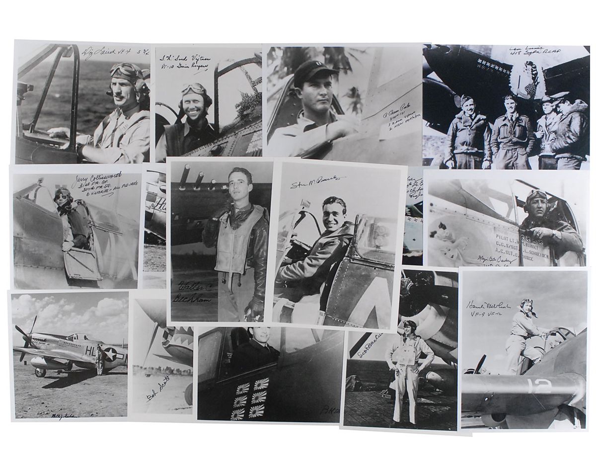 Collection of 15 glossy photos, 8 x 10 and 10 x 8, each signed in black felt tip or silver ink by the American fighter ace pictured. Signers are: Jack Ilfrey, Walter Beckham, Bud Peterson, Jerry Collinsworth, Lou Luma, Bob Barkey, Steve Pisanos, Wally Goehausen, Bruce Porter, Swede Vejtasa, Scott McCuskey, R. H. May, Hamilton McWhorter, Diz Laird, and Bob Scott, with many adding their rank or plane’s name. In overall fine condition.