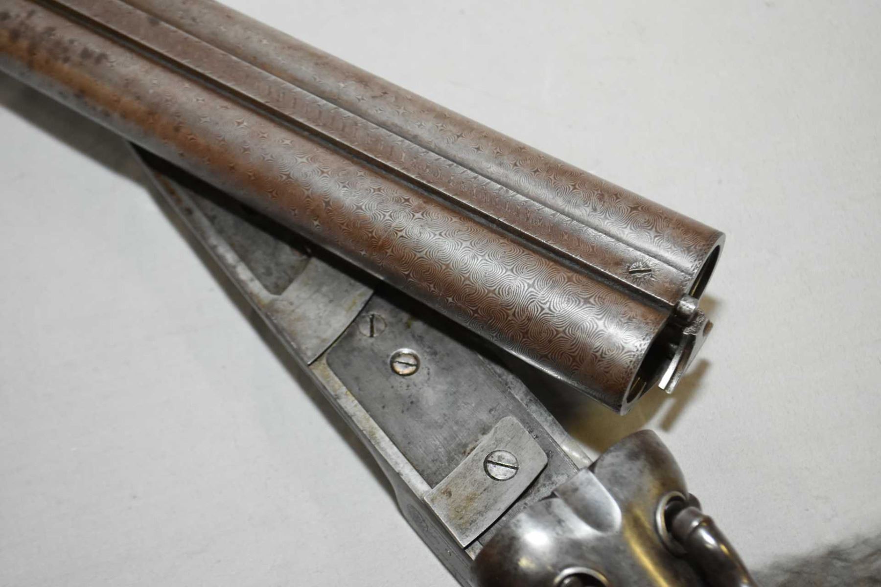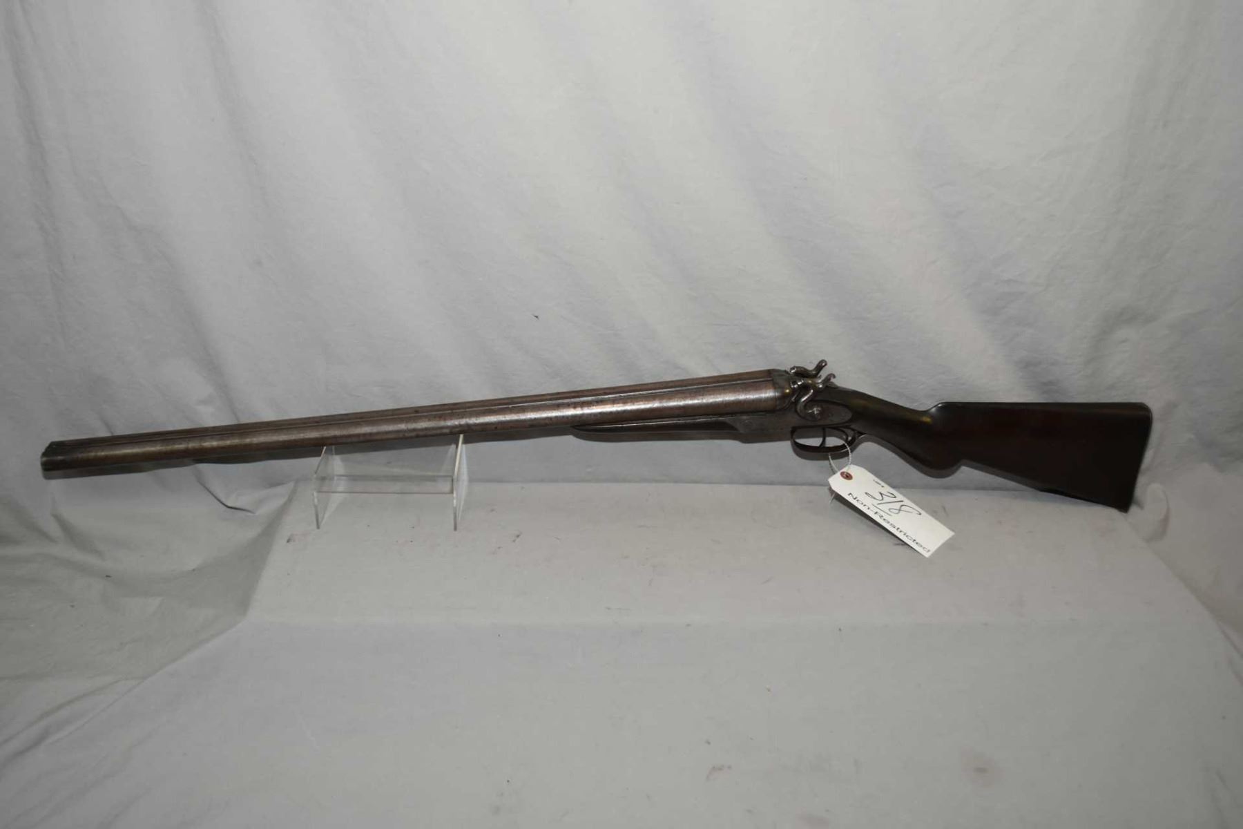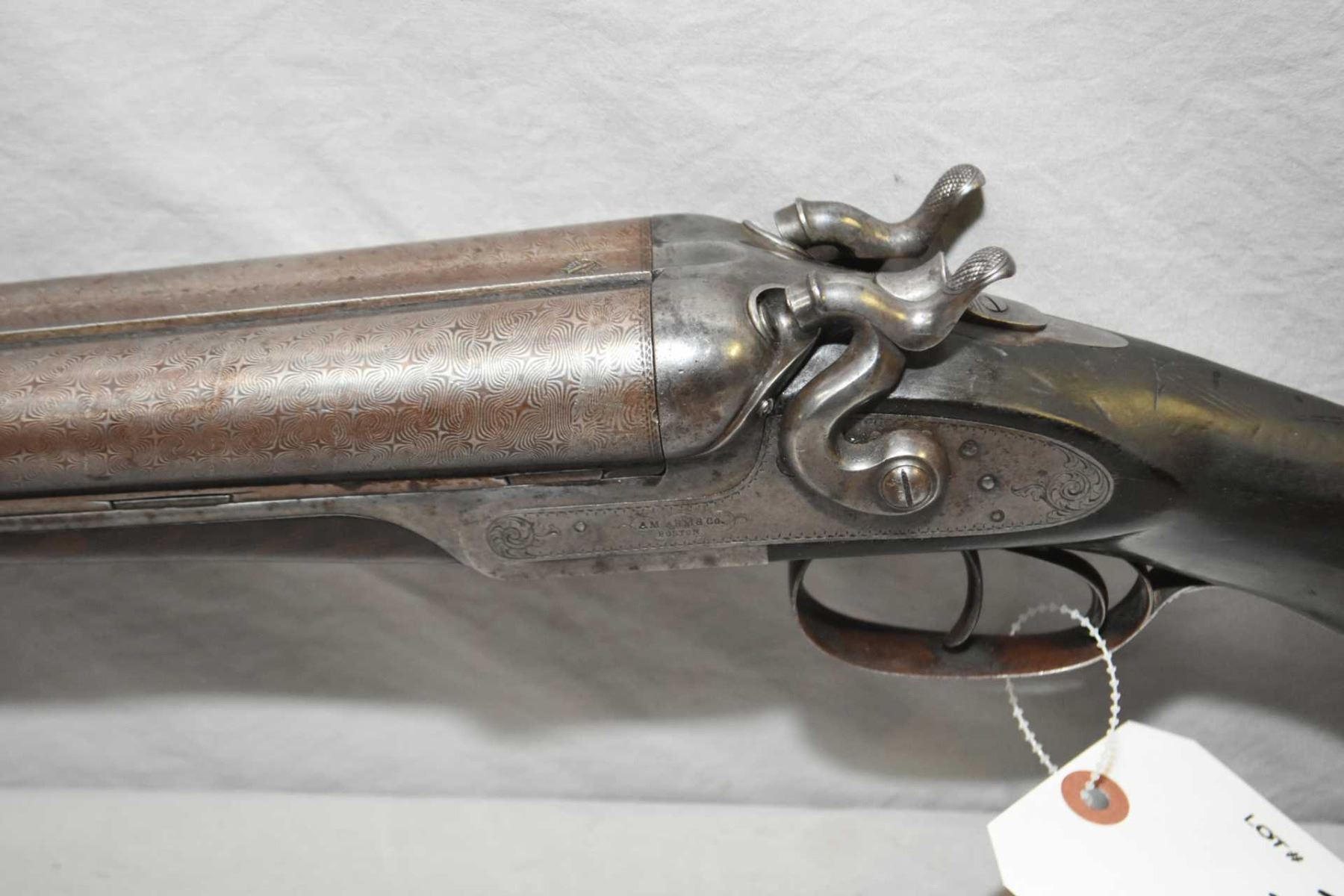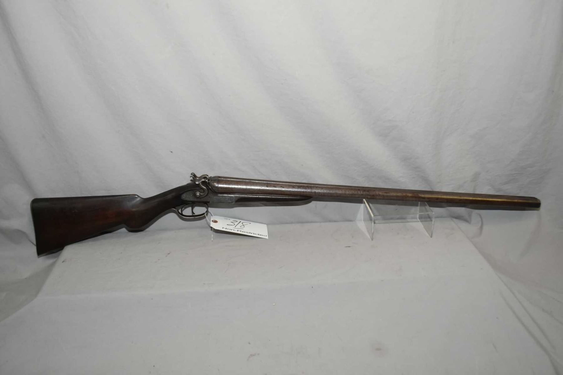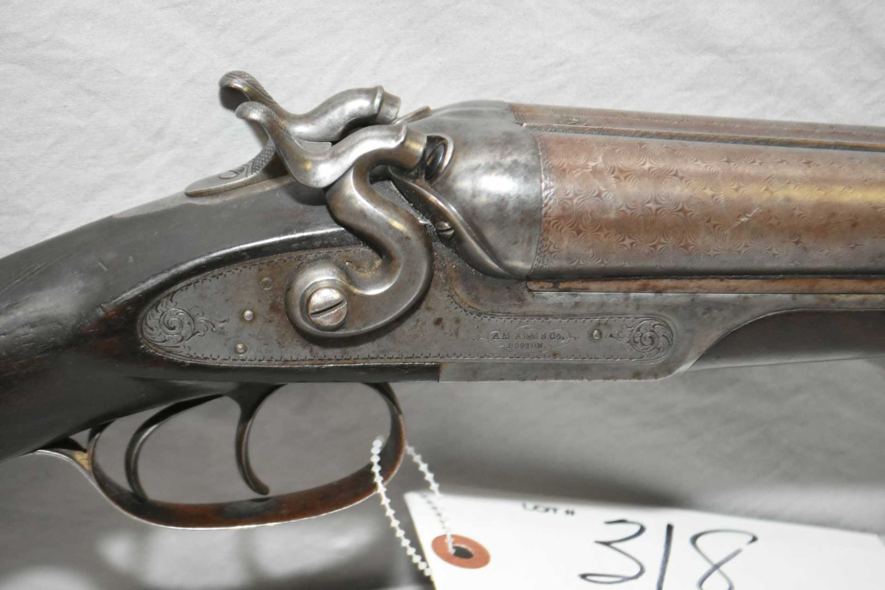 American Arms Co. ( Boston ) Model Side By Side Hammer .10 Ga Swing Action Shotgun w/ 30" Damascus Pattern Barrels [ note : unsual swing action turns barrels to the right, barrels turned a brown finish, have few small dings and bumps down the center rib, appears not bad down the bore, faded checkered rounded pistol grip stock & forend, lightly engraved case colored receiver, w/ metal butt plate and double triggers, Circa 1870 - 1884 ] Ser # Nil