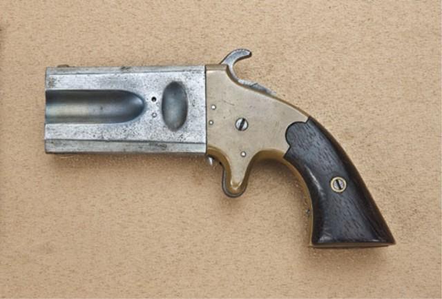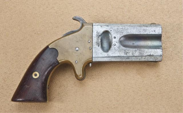 American Arms Co., Wheeler’s patent, .41 caliber over/under derringer, 2-5/8” barrel group, 6-1/4” overall. Brass frame, serial #343. The derringer remains in good original condition showing a grey patina finish on the barrels, drifting to brown. Traces of dark blue in the flutes. Some scattered light to moderate erosion and pinprick pitting. The barrel address and patent dates are fully legible. The frame shows a nice patina. The grips are good with even wear, slight losses, minor chips. The barrels are tight on the frame, the action is good, bores fair to good. A scarce American cartridge derringer in a desirable double-.41 caliber. Est: $600 - $1,200
