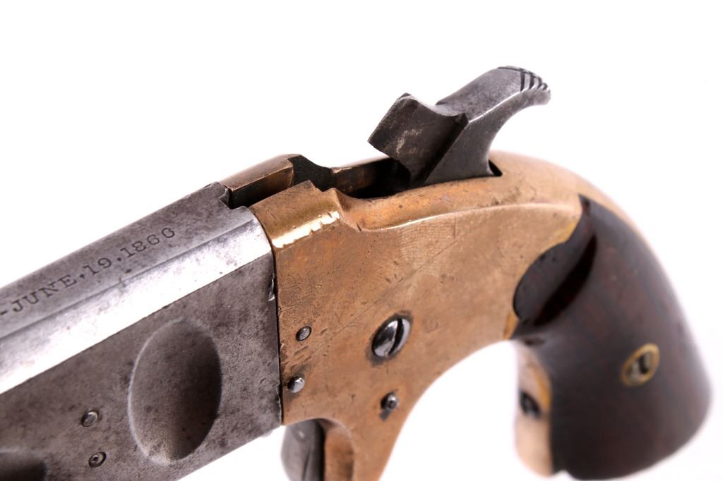 Offered in this lot is an American Arms Double Barrel .22 / .32 caliber Derringer. This Derringer features two barrels that operate on a swivel when the pistol is half cocked. The barrels are chambered in .22 and .32. The top side of the .22 caliber barrel reads "Wheeler's Pat. Oct. 31. 1865 - June 19. 1860" while the top of the .32 caliber barrel reads "American Arms Co. Boston, Mass." Both barrels measure 3" long. The frame is constructed from bass and features rosewood grips. Serial Number: 1615. This firearm qualifies as an Antique, and does not require FFL Transfer or NICS Background Check.