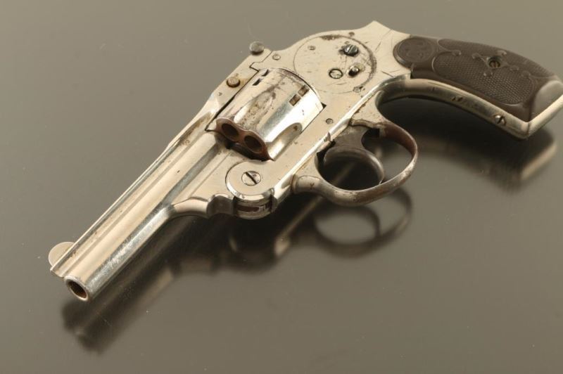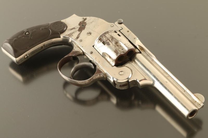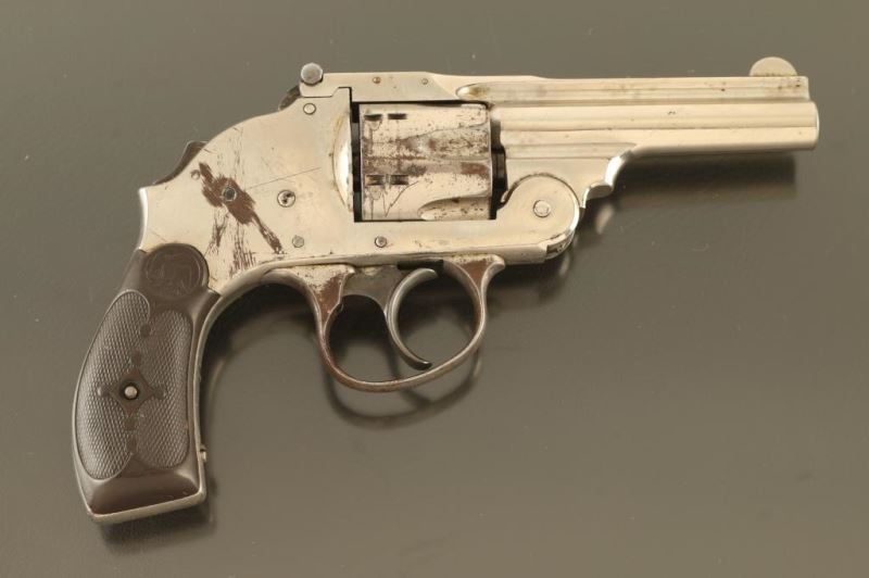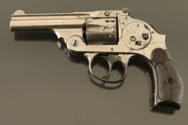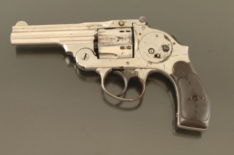 Features nickel finish, checkered black composition grips, 3.25" barrel, fixed sights, 6 shot fluted cylinder, double action only with internal hammer, safety lever on upper rear of frame. Bore is fair condition, dark with shallow rifling. Finish is fair condition, peeling or flaking on sides of frame, at triggerguard, round cylinder. Grips are good condition, solid, worn a bit smooth. Action is not functional; cylinder does not lock and trigger does not return. Several screws appear to be replacements. Condition is NRA Poor - needs repairs *** C&R Firearm ***