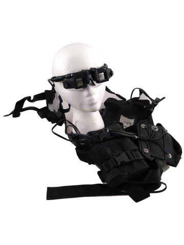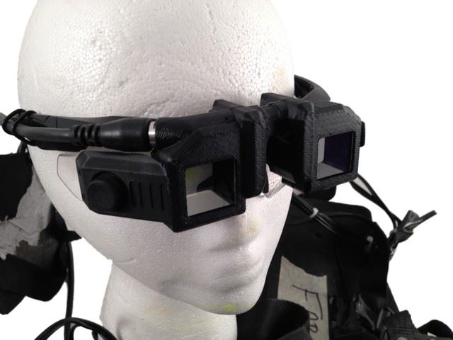 Fabio's screen worn, hero, virtual reality shooting equipment with multiple wires, glasses and body pieces.