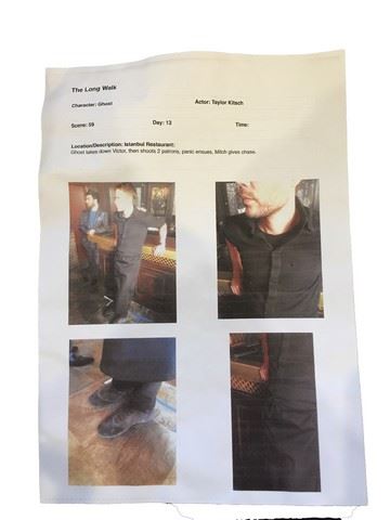 Ghost (Taylor Kitsch) screen worn, hero, black, "Haider Ackerman" (xs) dress shirt, black, "James Perse" (1) v neck t shirt, "J Brand", black denim jeans (32), with black belt and black apron. Includes wardrobe tag.