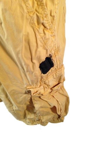 Mitch Rapp (Dylan O'Brien) screen worn, hero, dark yellow with waist tie and cargo pockets 'Yosemite James Perse' swim trunks with hole for gunshot on the side, and navy blue rubber and plastic 'Havaianas' sandals. (size 43-44)