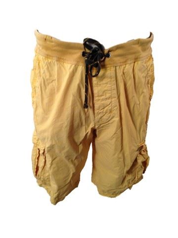 Mitch Rapp (Dylan O'Brien) screen worn, hero, dark yellow with waist tie and cargo pockets 'Yosemite James Perse' swim trunks with hole for gunshot on the side, and navy blue rubber and plastic 'Havaianas' sandals. (size 43-44)