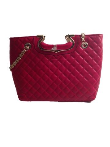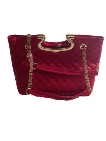Screen used, red quilted stitch purse with gold chains and a gold design at the top of the purse. (16x11)