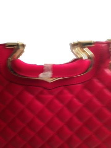 Screen used, red quilted stitch purse with gold chains and a gold design at the top of the purse. (16x11)