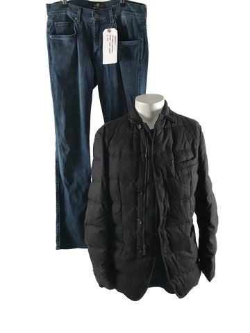 Stan Hurley (Michael Keaton) screen worn, hero, black quilted long sleeve button and zipper front "Ralph Lauren' jacket, (size M) purple short sleeve crew neck 'St. John's Bay' t-shirt, (size M) and blue denim '7 For All Mankind' jeans. (size 30) Includes wardrobe tag.