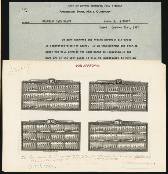 NY, 1927, Four 1928 calendars (arranged 2x2) engraved proof with end customer notations below and ABN embossed imprint, Includes correspondence from end customer indicating approval and desire for quick processing, VF condition. ABNC.