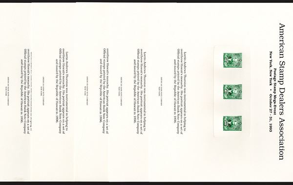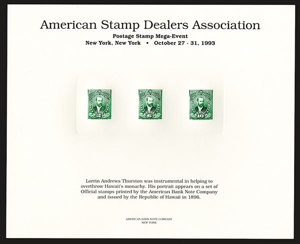 United States. Includes three Republic of Hawaii stamps featuring Lorrin Andrews Thurston from 1896. Color is green. As made. 5 pieces.