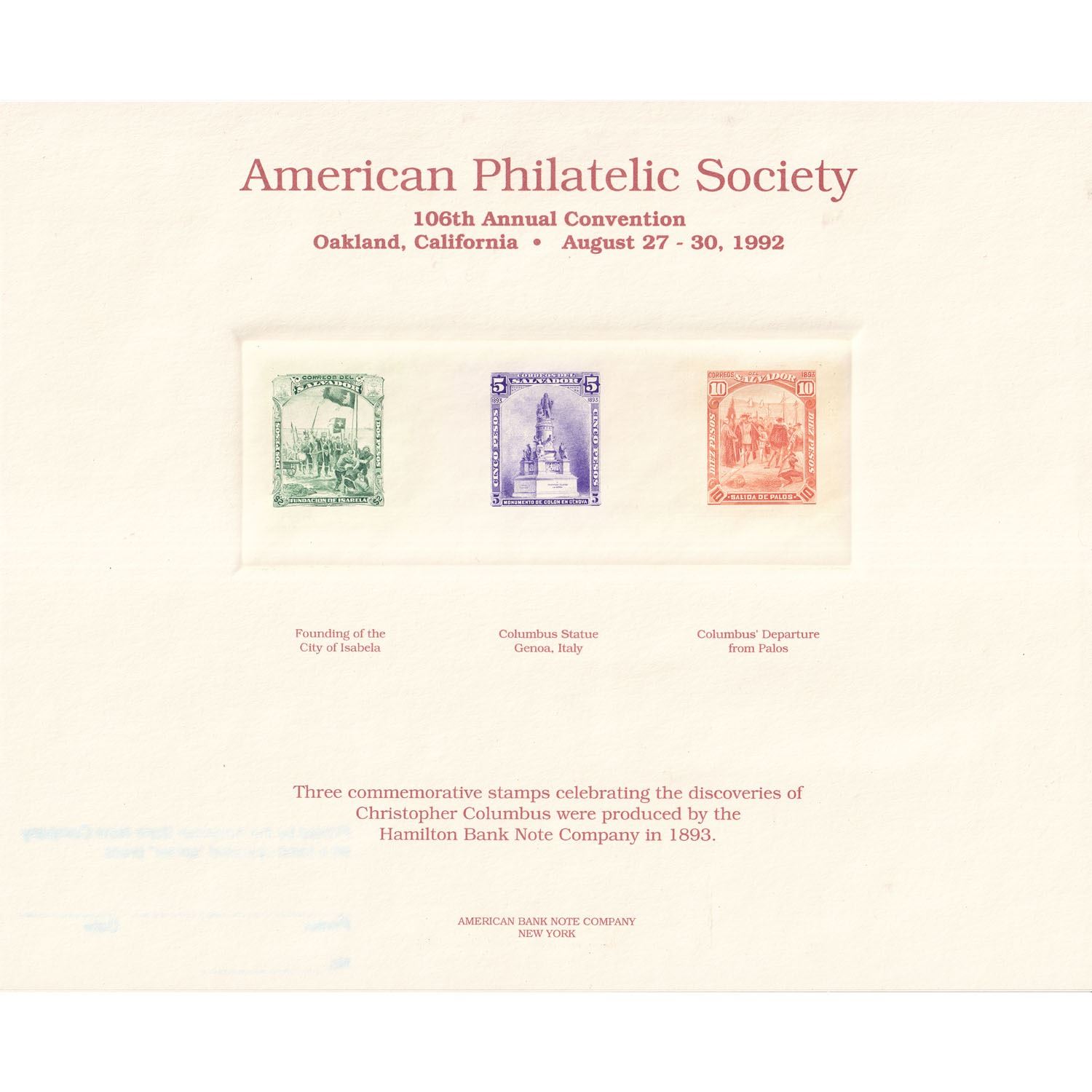 American Bank Note Commemoratives 1992 American Philatelic Society 106th Annual Convention 'Three Commemorative Stamps celebrating the discoveries of Christopher Columbus' - Founding of the City of Isabela, Columbus Statue in Genoa, Italy & Columbus' Departure from Palos.