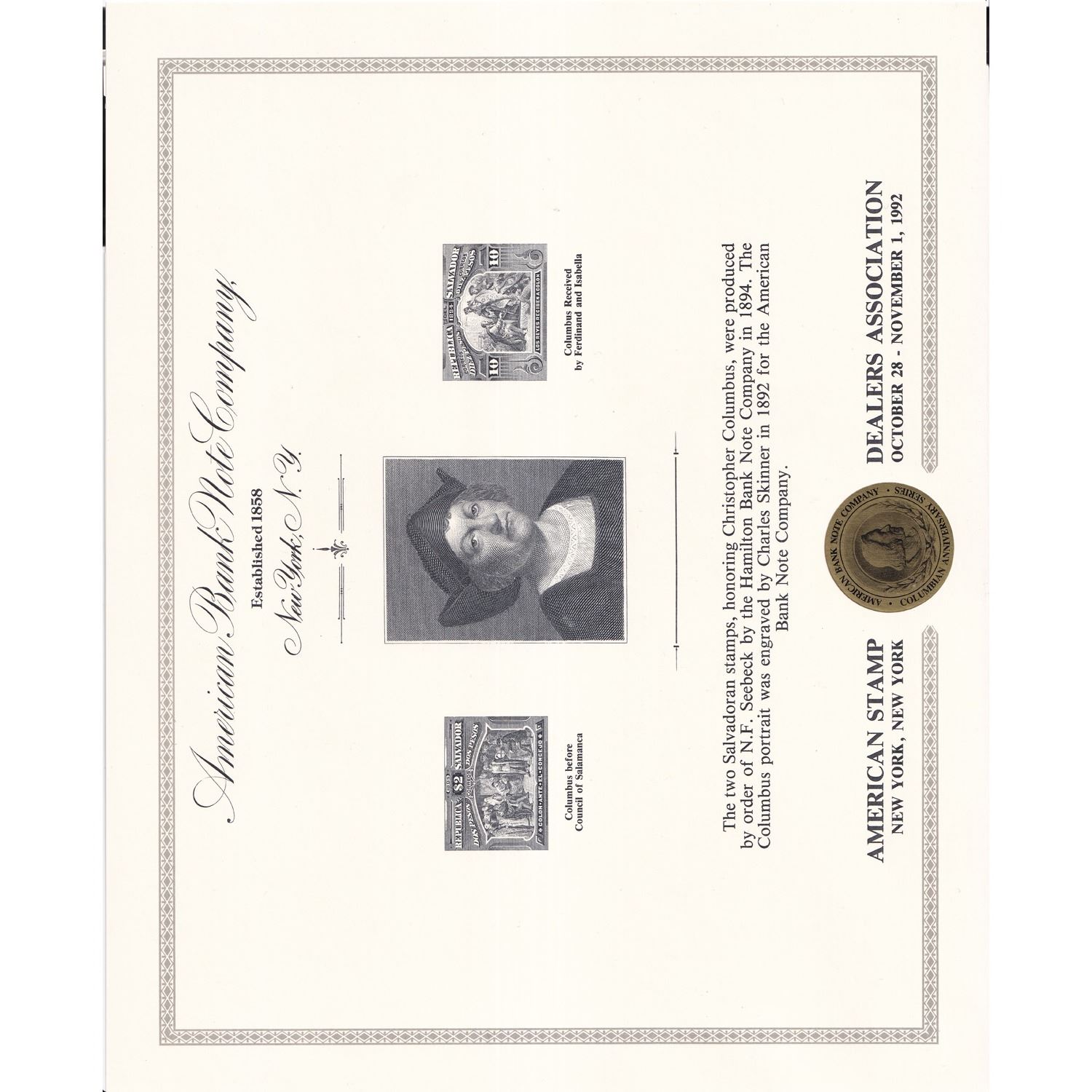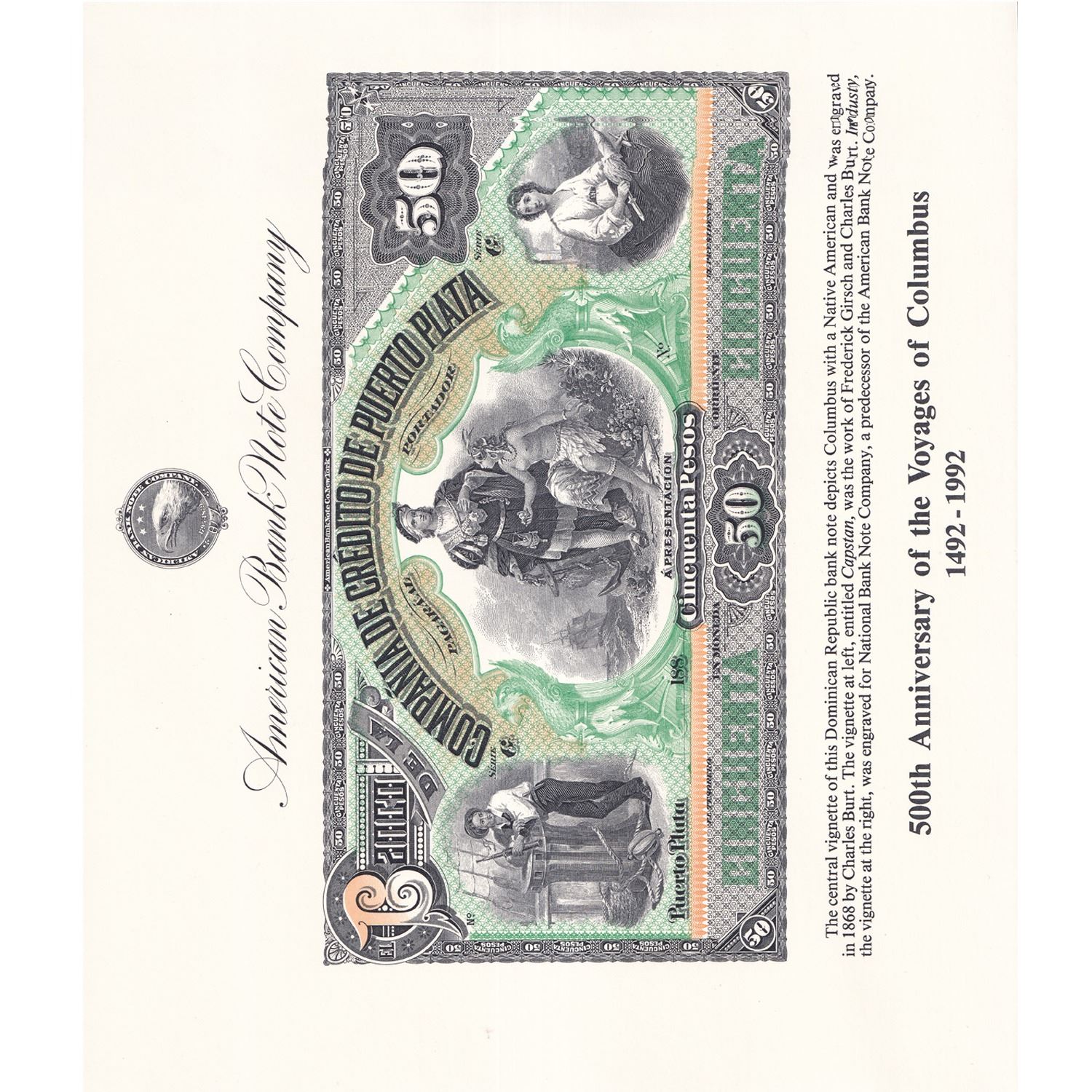American Bank Note Commemoratives Souvenir Card Album. Contains many different Intaglio prints: Includes 1888 Mexico 50-Peso, Hawaii 1893 25ct Stamp, Hawaiian Islands Postage 5ct, The Iron Horse, Salvadoran Stamps honoring Christopher Columbus 1892/1894 & 1868 Dominican Republic 50 Pesos note. 5 sets