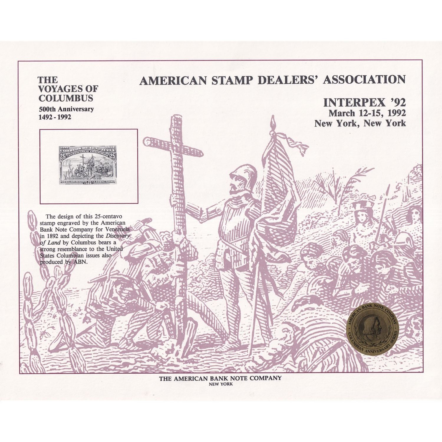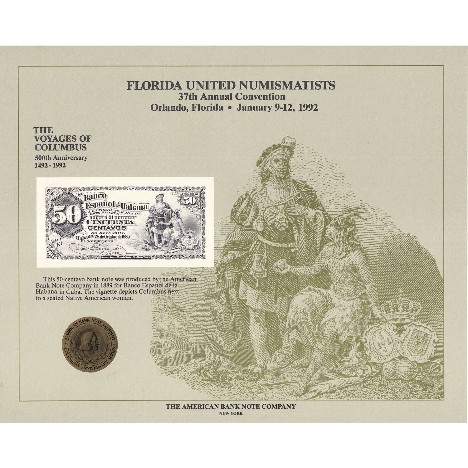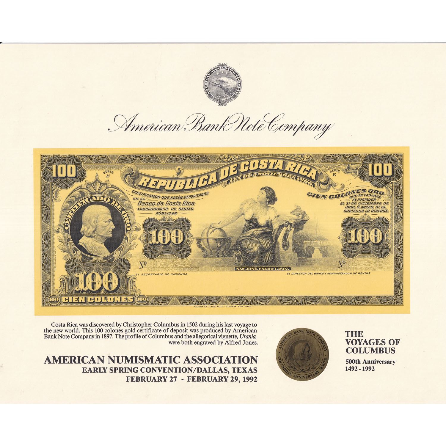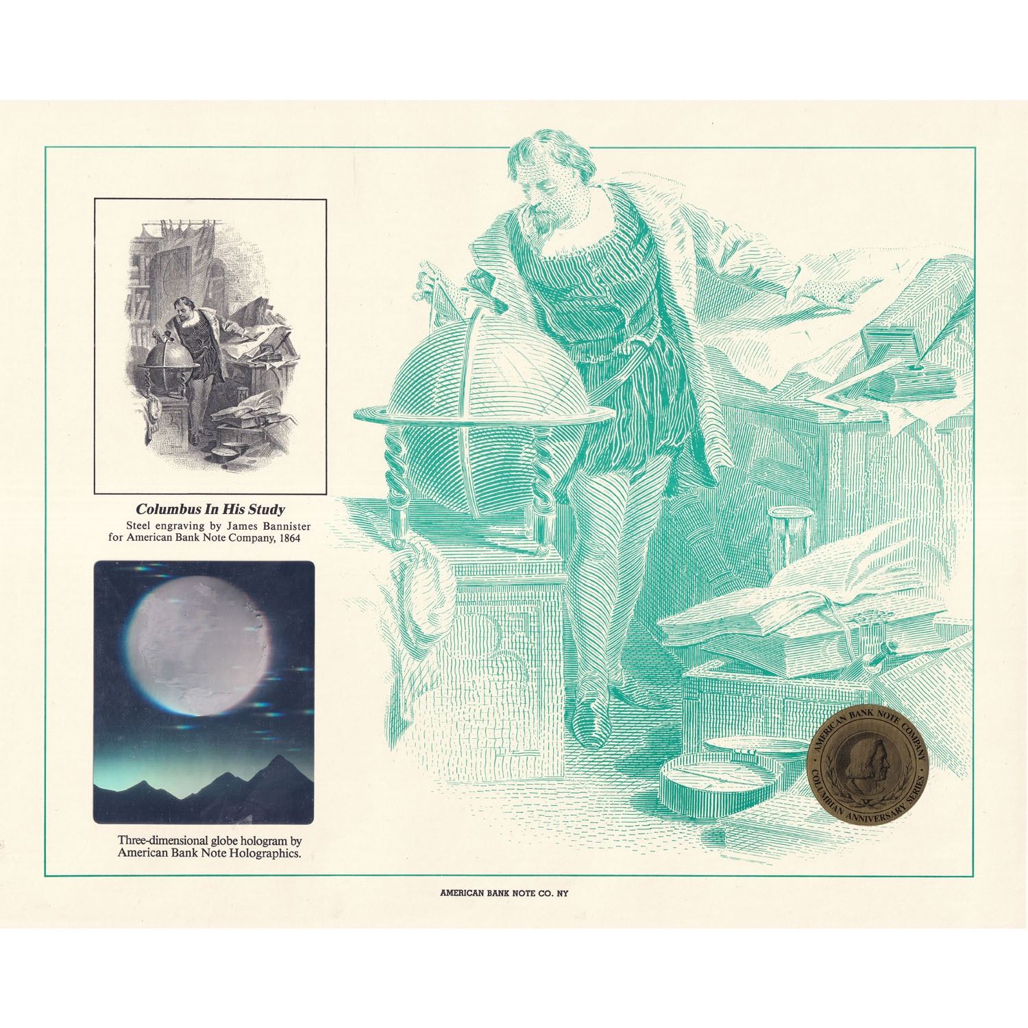 American Bank Note Commemoratives Souvenir Card Album. Contains many different Intaglio prints: Includes 1897 Costa Rica 100 Colones Banknote, 1864 'Columbus in His Study' Steel Engraving by James Bannister, 1892 Venezuela 25-centavo Stamp & 1889 Cuba 50-centavo Stamp. 4 sets