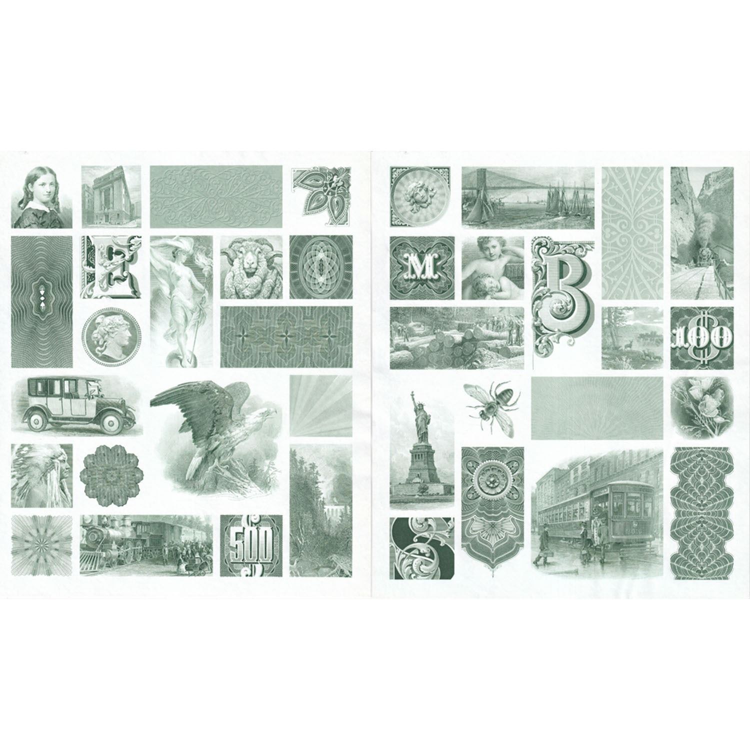 American Bank Note Commemoratives Souvenir Card Album. Contains some intaglio prints and Official postal souvenir reprints. Includes Banknote and Stamp design pictures on sheets of 2 different designs - 2x $100 and 2x $500, 6x World's Columbian Exposition Admit the Bearer 'Good for one admission at pay gates' reprint cards & 12x Official Souvenir Postal Card reprints for the World's Columbian Exposition. 4 sets