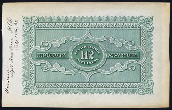 New York, NY, 1882, Specimen advertising note back, ÒPentographic Specimens - Broadway - 142- New YorkÓ printed on banknote type of paper in light green with archival notations ÒStandard Light Anti-Green - Feby 25th, 1882, (A.G.G.)Ó on left excess margin, ornate engraved pattern, back blank, au TO Uncirculated, ABNC.