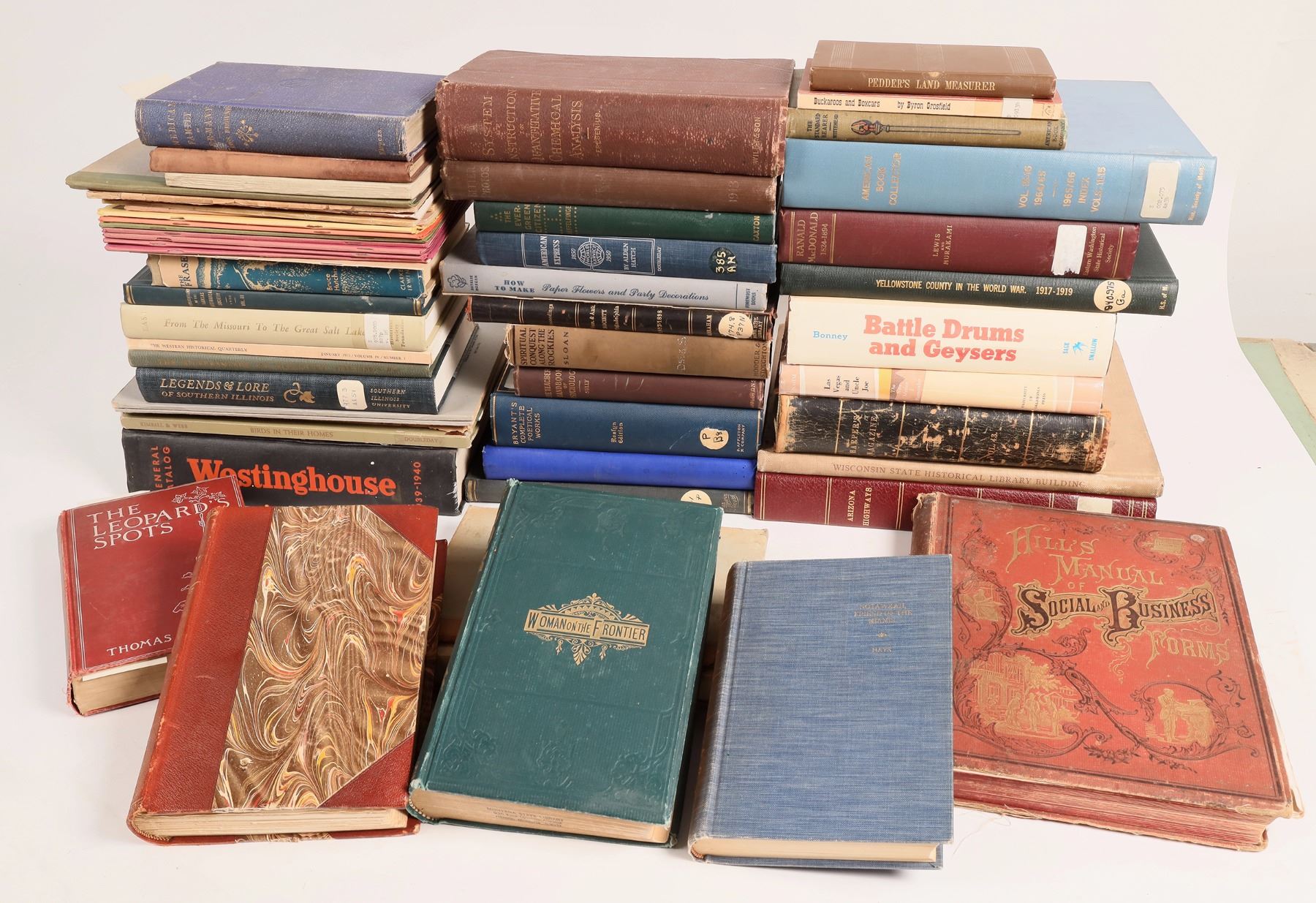 About 50+ American books and publications. Spiritual Conquest Along the Rockies by Sloan 1913. The Teacher's Handbook of Psychology by Sully 1897. Bryant's Complete Poetical Works, Roslyn Edition 1916. Arizona Highways 1945. Las Vegas and Uncle Joe by Nahm. Bound Harper's Magazine 1871. Lovell's Library The Story of a Sculptor by Conway. Wisconsin Memorial Volume 1901. 7 Bulletin of the Chicago Historical Society 1934-37. Rebound Historical Society of Southern California, Los Angeles 1890. American Law Primer by Leahy 1889. An American Family in Germany 1867 by Browne. The Leopard's Spots by Dixon. History of the Navy by Maclay 1898. Notawkah, Friend of the Miamis by Hays 1936 and much more. 79 lbs.