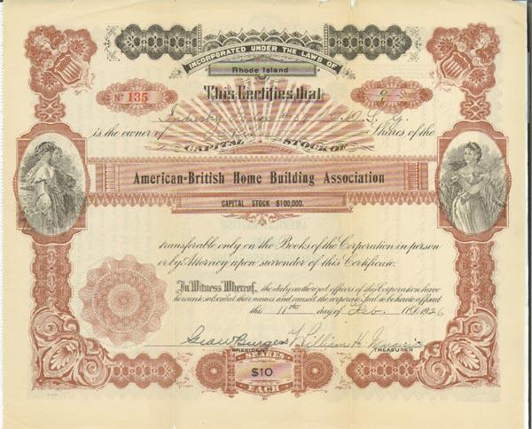 1926, Rhode Island. Stock certificate for 9 shares. Brown/Black. Side vignettes of allegorical figures. Uncancelled. Very fine.