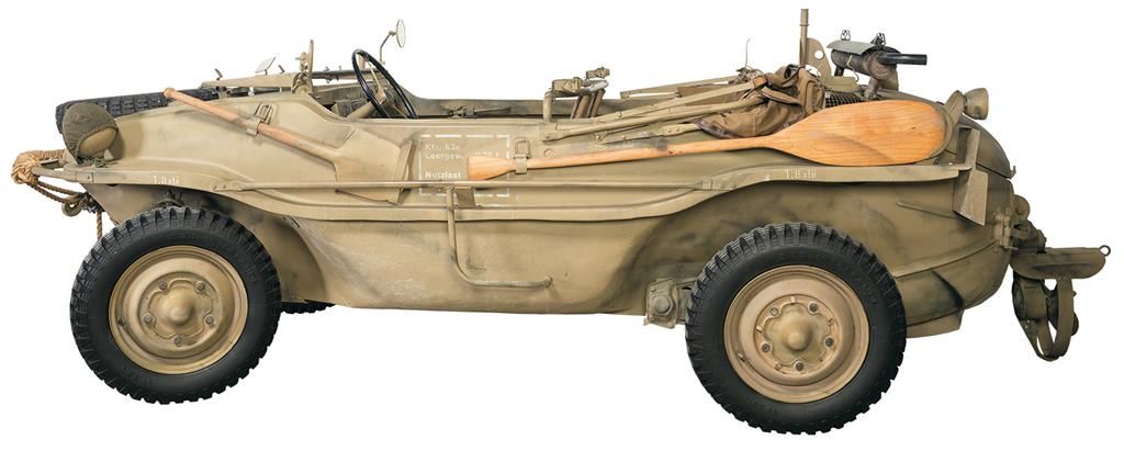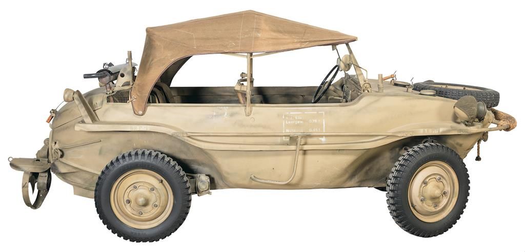 A third-generation descendent of the original KdF-Wagen (later more famous as the Beetle), the Schwimmwagen (Swimming Wagon or Floating Wagon) was developed from the Kubelwagen, Nazi Germany's answer to the American Jeep, with Ferdinand Porche's original flat-bottomed body discarded for a unified 'bodytub' developed by Erwin Komenda, one of Porche's top body design men. Although this change compromised the Schwimmwagen's off-road capabilities, the flat bottom would put the center of gravity on the vehicle too high while in the water, rendering it unstable. Additionally, the overall wheel base had to be narrowed in order to accommodate the new body. With the Komenda-designed body, the 166 could operate on water while still being a serviceable off-road vehicle, seeing use on nearly every German front of the war. Although the Type 166 holds the distinction of being the most produced amphibious vehicle in automotive history, with over 15,000 rolling off the lines between 1941 and 1944, very few have survived to today, with less than 200 known to still exist in any condition, and as few as 13 in an original state. Measuring approximately 13 1/3 feet long from the raised propeller to the front bumper and 5 feet wide from side rail to side rail, this reproduction of the Type 166 was built using a combination of original Volkswagen components and American fabricated parts, with the majority of the body structure constructed from steel and fiberglass, with a mixed brown and green camouflage paint job applied over the surface. The interior features a set of four steel bucket seats with padded canvas covers, a pair of clamping brackets for weapons storage, and a convertible canvas roof which links to the folding windshield. The wheels are outfitted with a set of 'GELANDE' tires, with a fifth mounted in the spare position on the front. A set of blackout hoods are mounted onto the headlights, with pintel-style weapon mounts at the front and rear passenger side corners of the vehicles. At the rear of the vehicle is a 10 inch diameter 3-bladed propeller, which is hinged to be pulled up when the vehicle is traveling on land and dropped just before entering the water. The engine is a repurposed Volkswagen 1600cc engine.