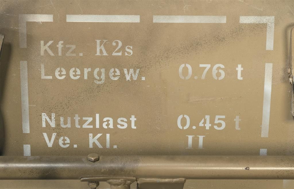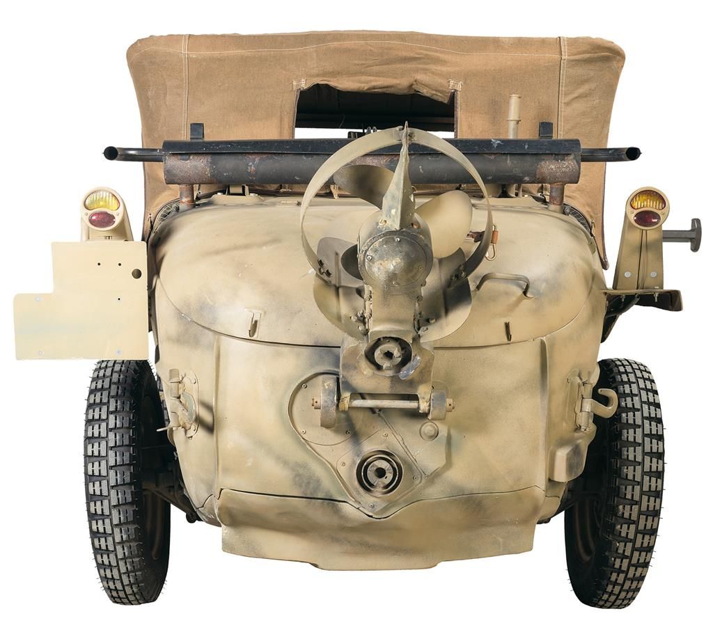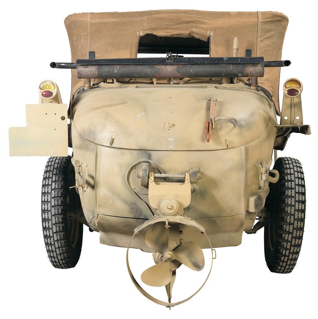 Very good overall, with some minor wear on the exterior paint, and light cracking on the leather straps securing the roof and propeller. Engine runs fine and is very drivable. A fine demonstrative example of one of the key Axis Powers vehicles of the Second World War, which would be a great representative piece in a military vehicle collection or a sure-fire head turner at a car show. Please note that this reproduction Type 166 is a fully titled automobile, but the craftsman responsible for producing it instructs the successful bidder not to take it into the water.