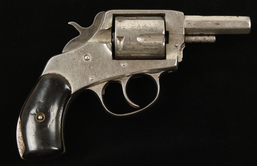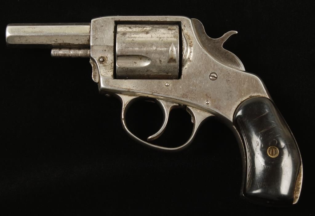 Early double action 5-shot revolver. With 2-1/2" octagon barrel, nickel finish, checkered plastic grips, and grooved top sight. Poor bore and action. Condition: Poor to fair as action is not working. Light pitting throughout, missing front sight, and grips are well worn showing small loss on each panel. *Antique Firearm*