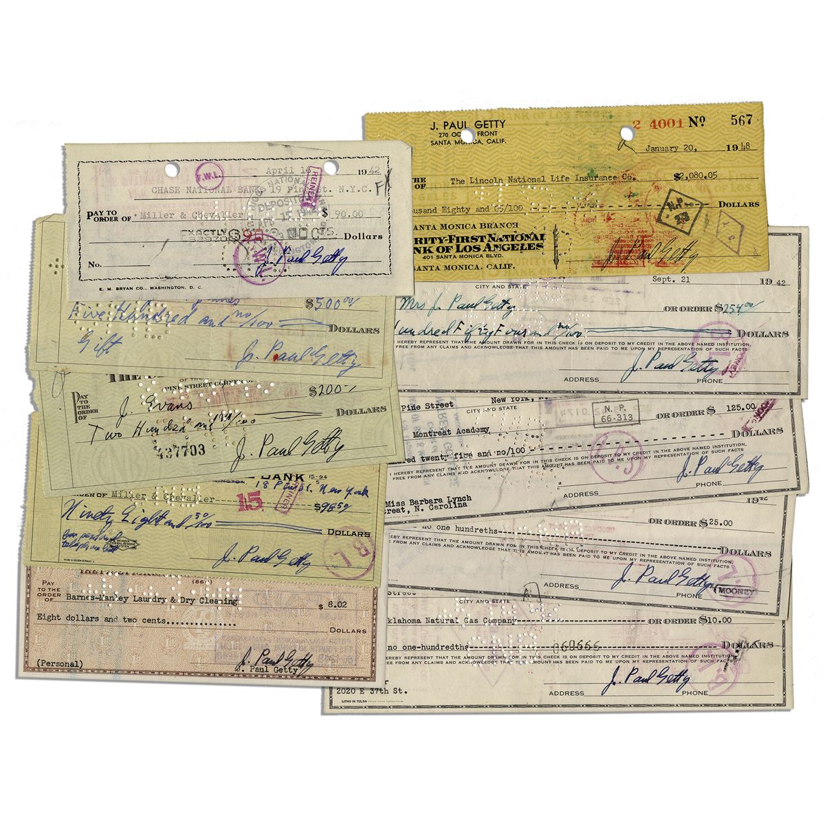 Lot of 10 checks signed by oil billionaire J. Paul Getty. Most are dated in the 1940's, though one is dated in 1953. Each check is made out in type and signed in ink, ''J. Paul Getty''. Getty was known for his penny-pinching, even negotiating the kidnapping ransom for his grandson. Checks vary in size; 4 measure 8.25'' x 3'' and six measure 6.5'' x 3'', each with standard bank cancellations and filing punch holes. Overall very good to near fine condition.