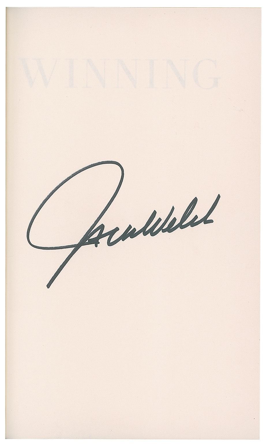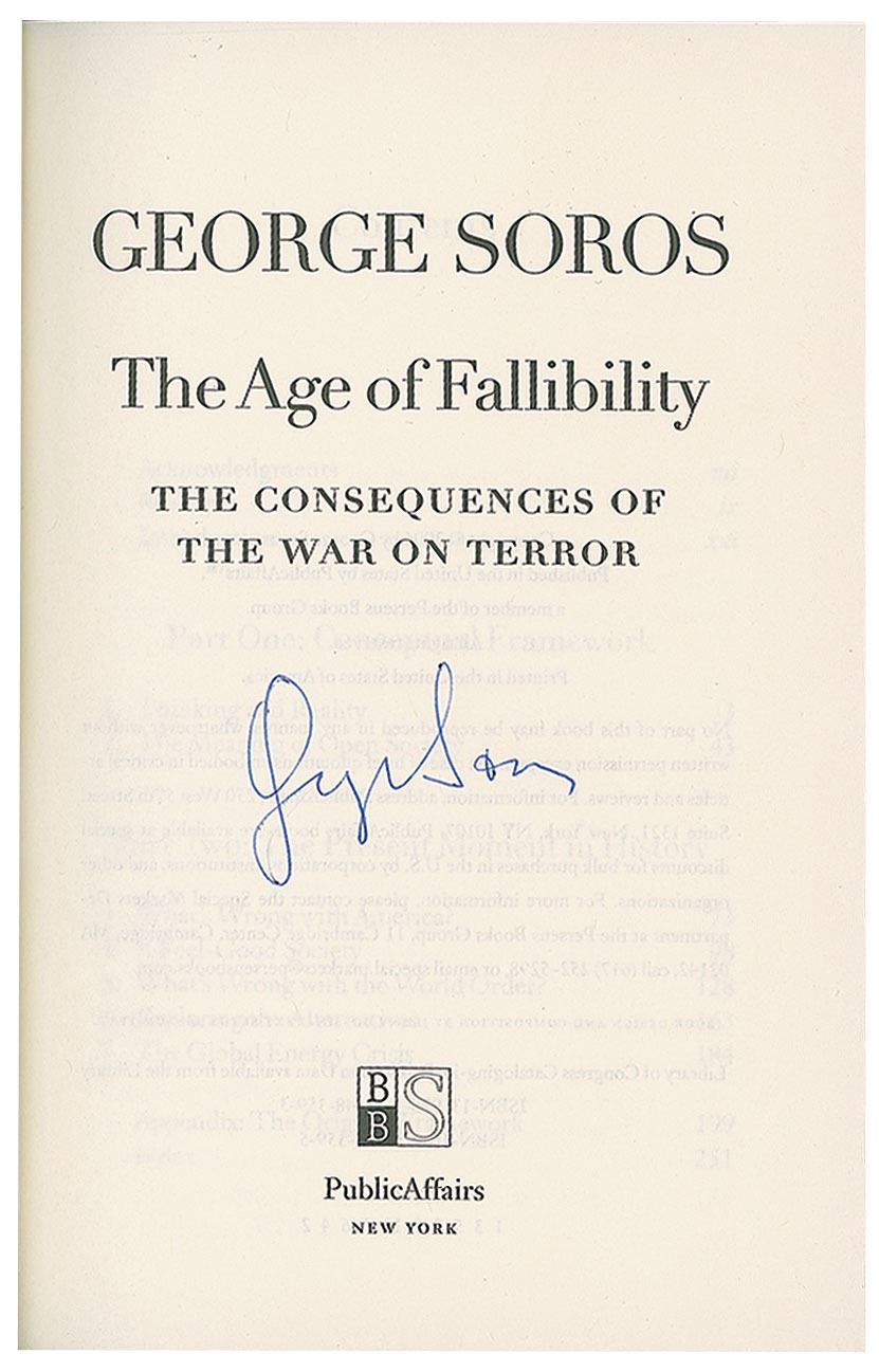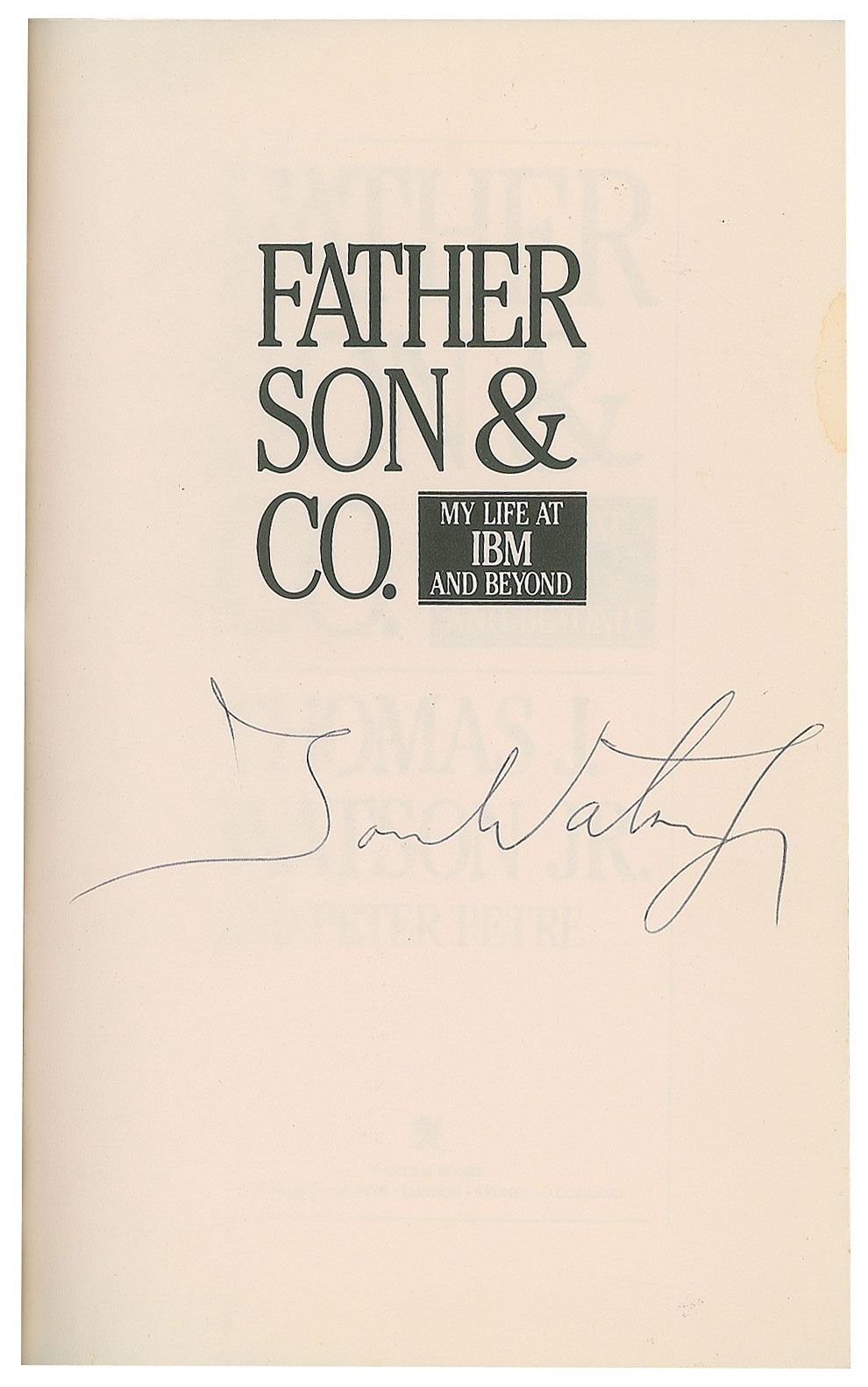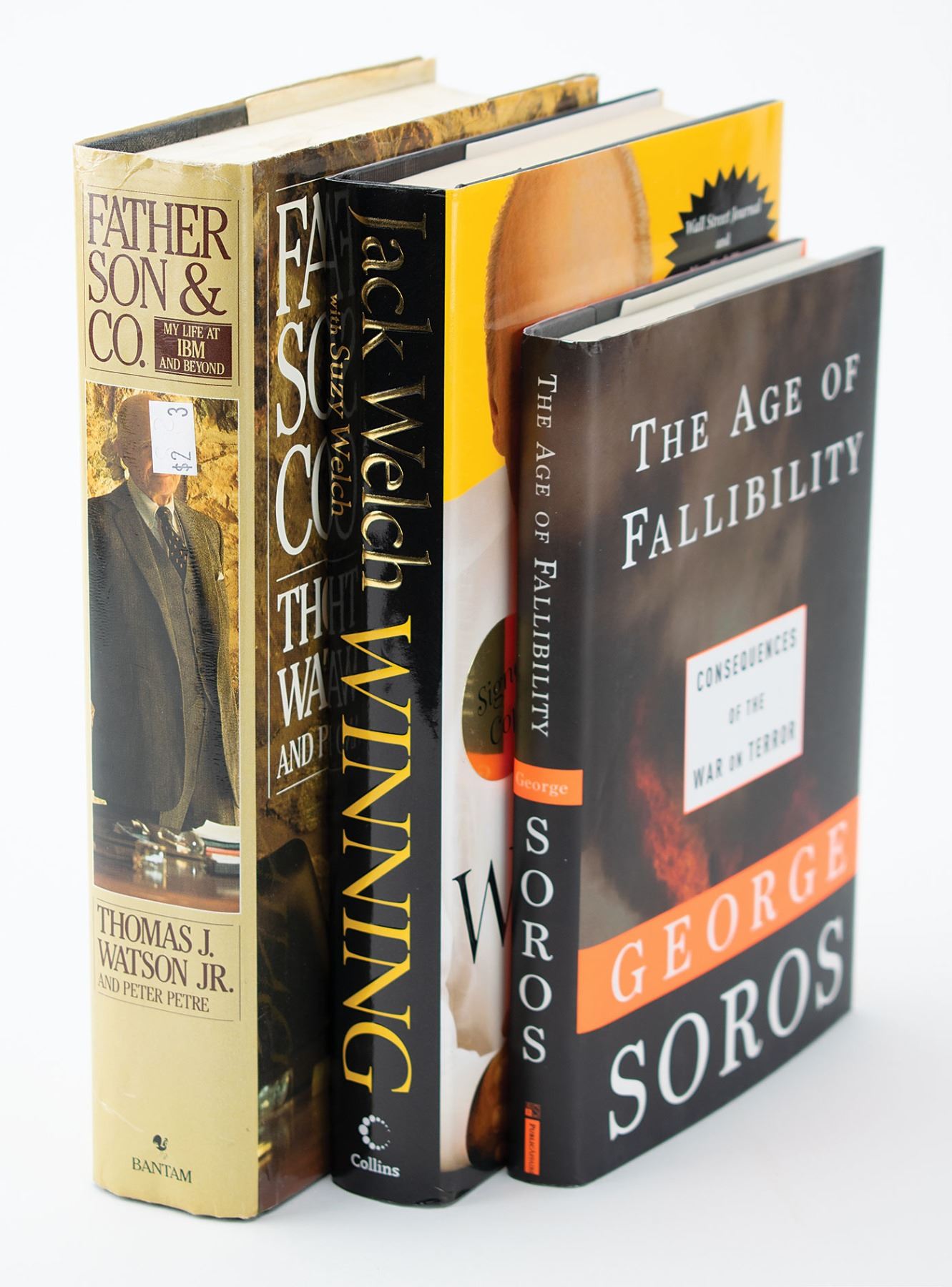 Three books, each hardcover with dust jacket, individually signed on an opening page by a notable businessman: George Soros (first edition of The Age of Fallibility), Thomas J. Watson, Jr. (first edition of Father, Son & Co.: My Life at IBM and Beyond), and Jack Welch (Winning). In overall fine condition, with a price sticker on the Watson dust jacket spine.