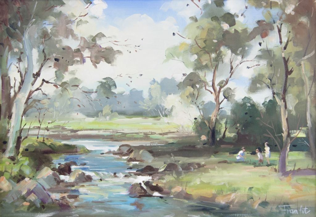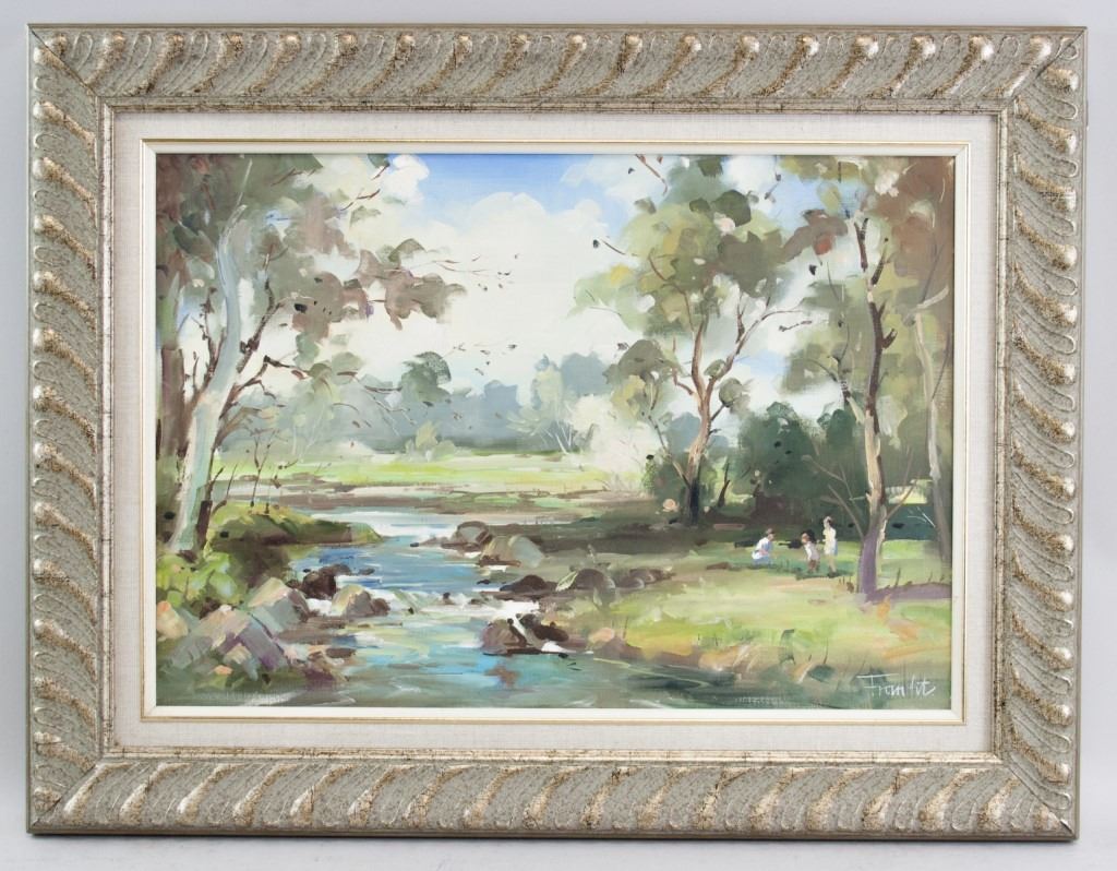 Oil on canvas, framed. Featuring three children playing in the woods beside a river. Signed "Frim Fit" to the bottom right corner. Canvas size: 34 x 50 cm (135 x 19.5 inches). Frame size: 51 x 65 cm (20 x 25.5 inches).